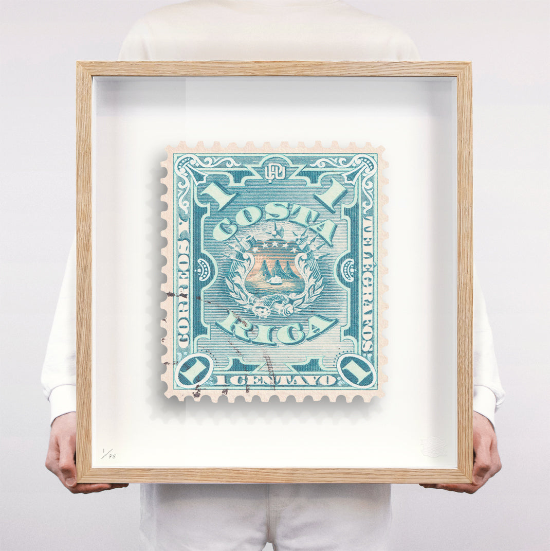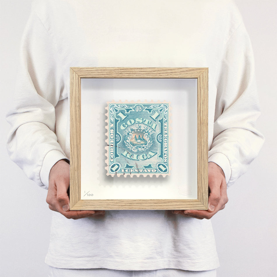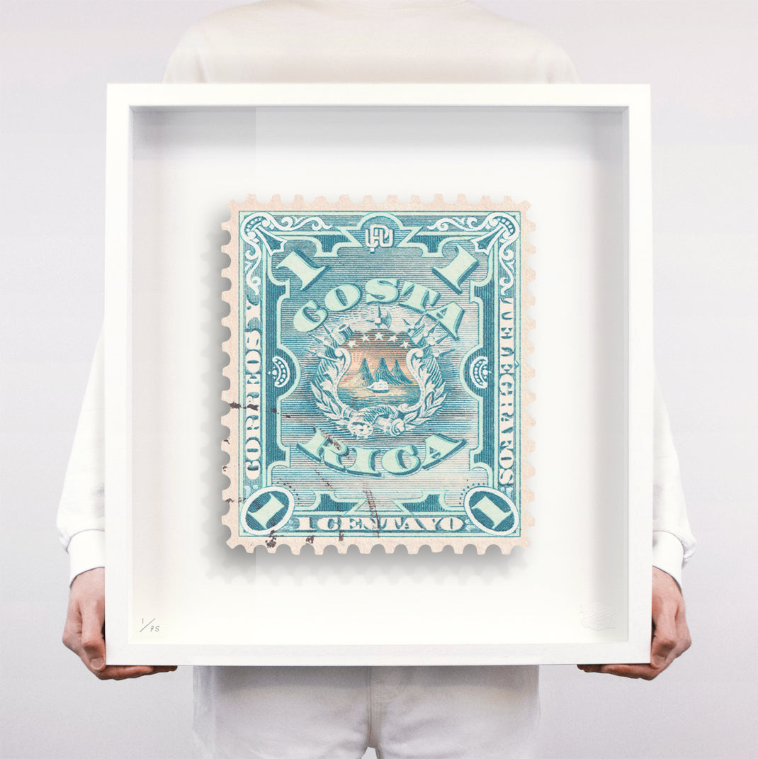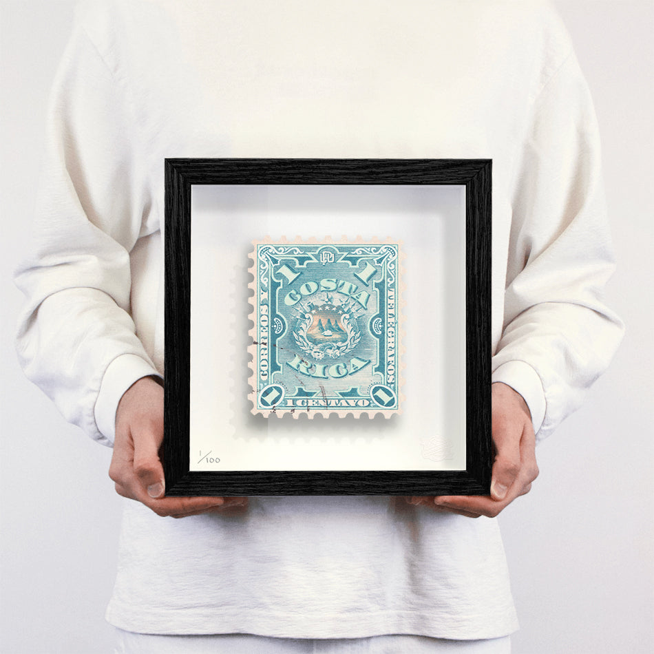 Each artwork by Guy Gee has been digitally reimagined from an original postage stamp. Printed on archival mount board, the artwork is then float mounted and editioned. Finally the stamp is housed in one of the studio’s bespoke made box frames by the team.