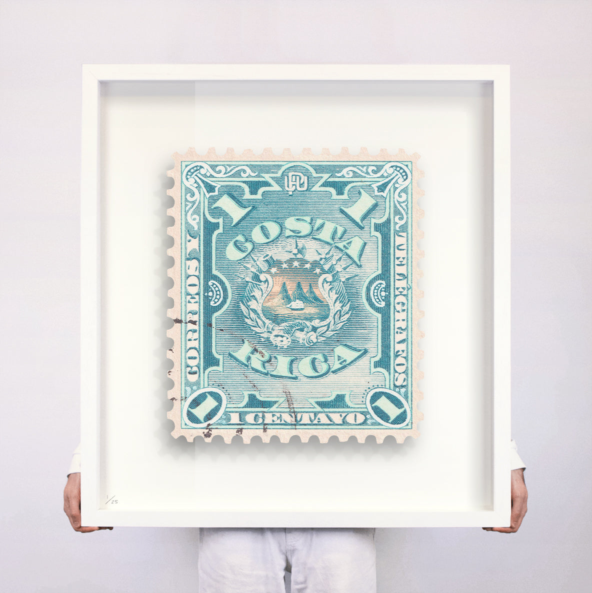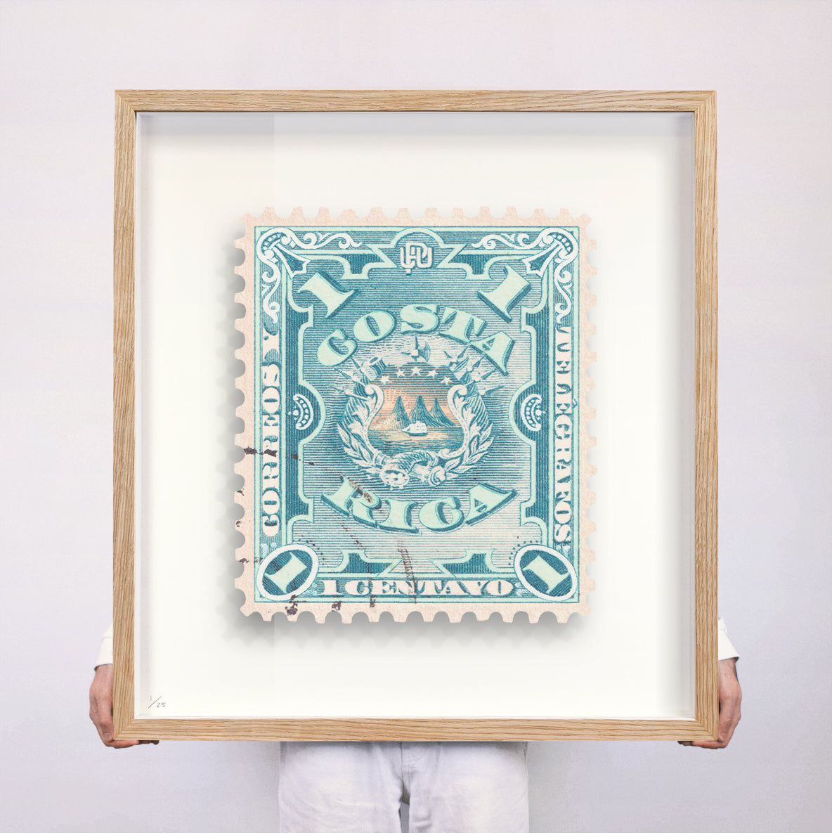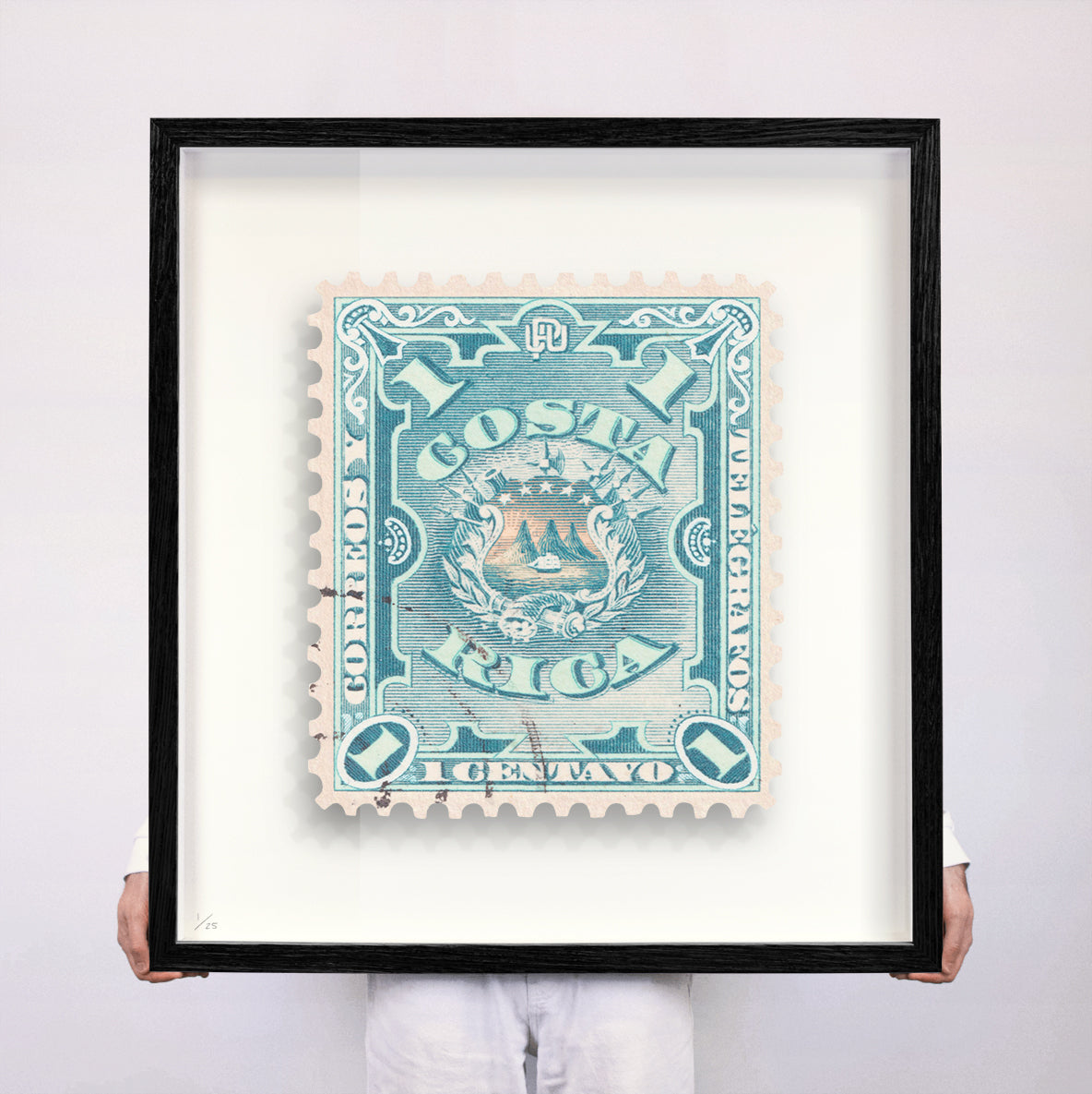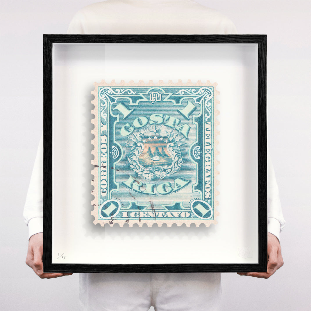 Each artwork by Guy Gee has been digitally reimagined from an original postage stamp. Printed on archival mount board, the artwork is then float mounted and editioned. Finally the stamp is housed in one of the studio’s bespoke made box frames by the team.