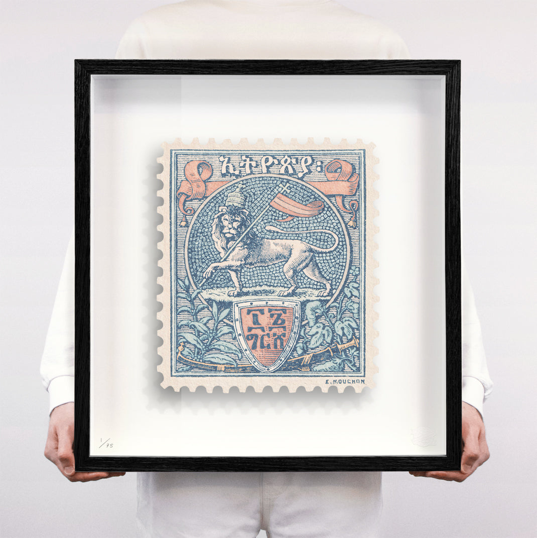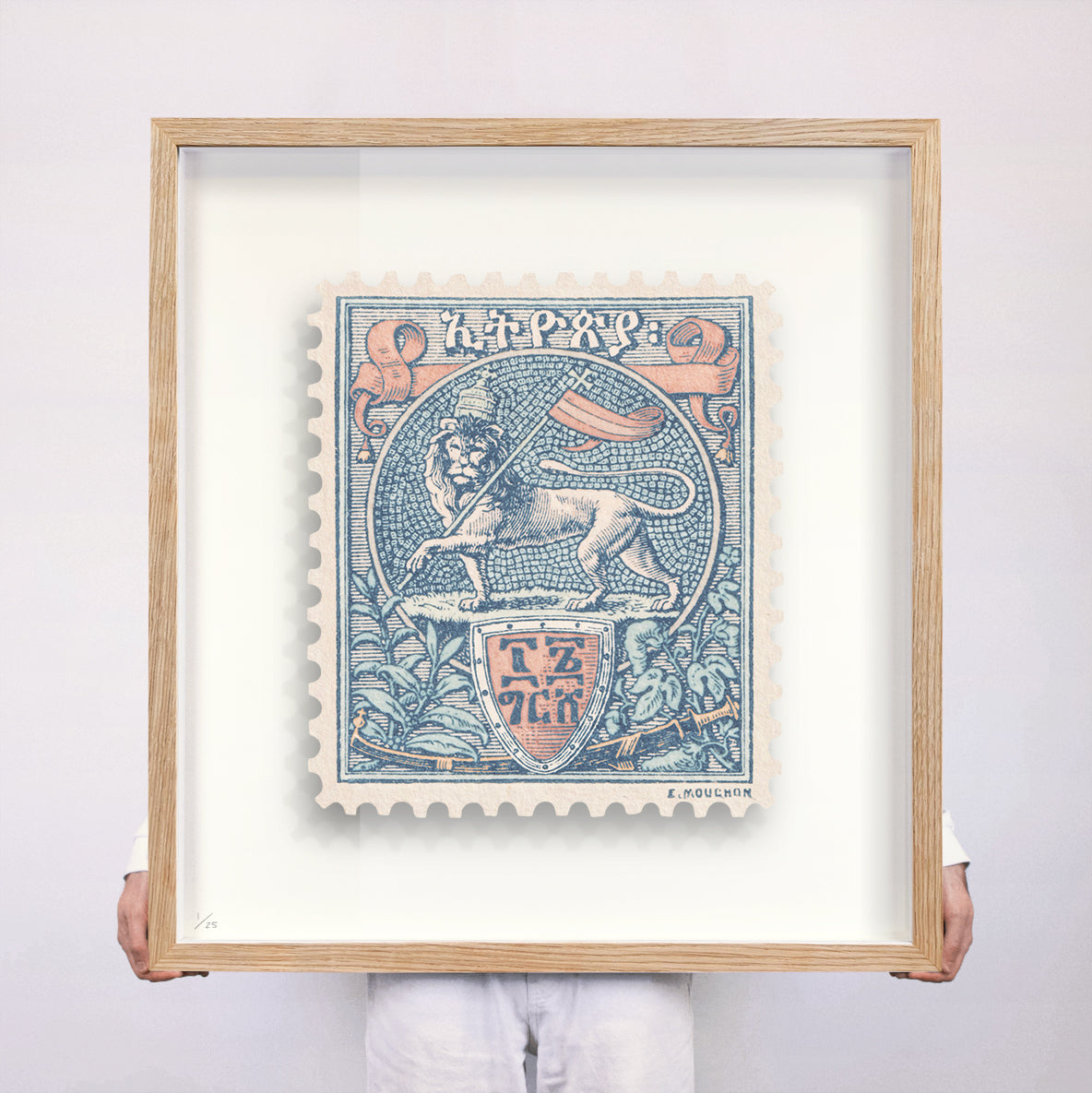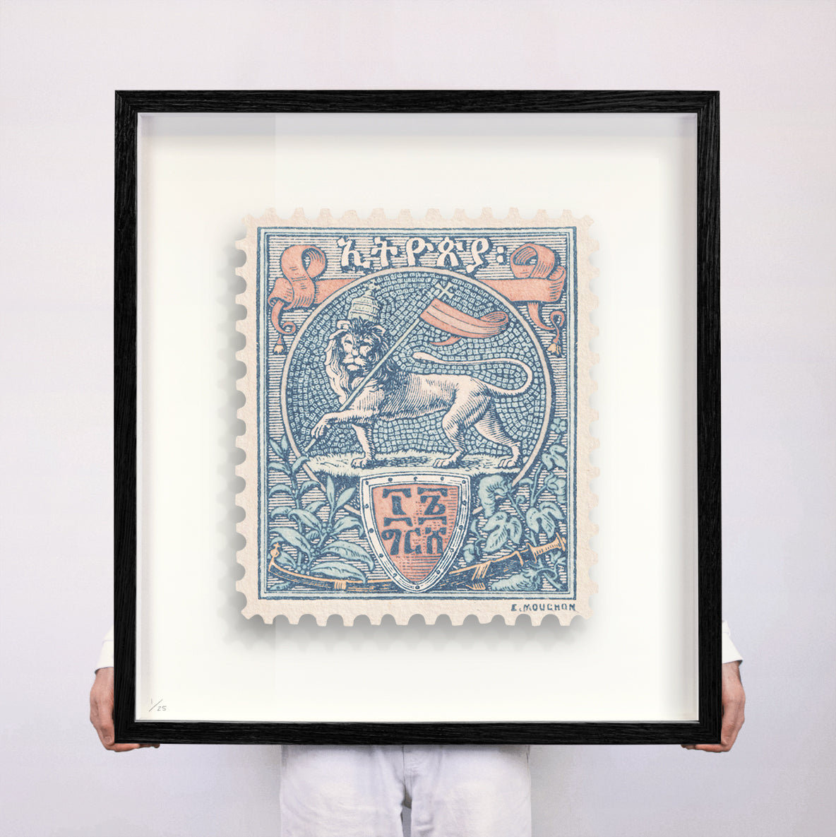 Each artwork by Guy Gee has been digitally reimagined from an original postage stamp. Printed on archival mount board, the artwork is then float mounted and editioned. Finally the stamp is housed in one of the studio’s bespoke made box frames by the team.
