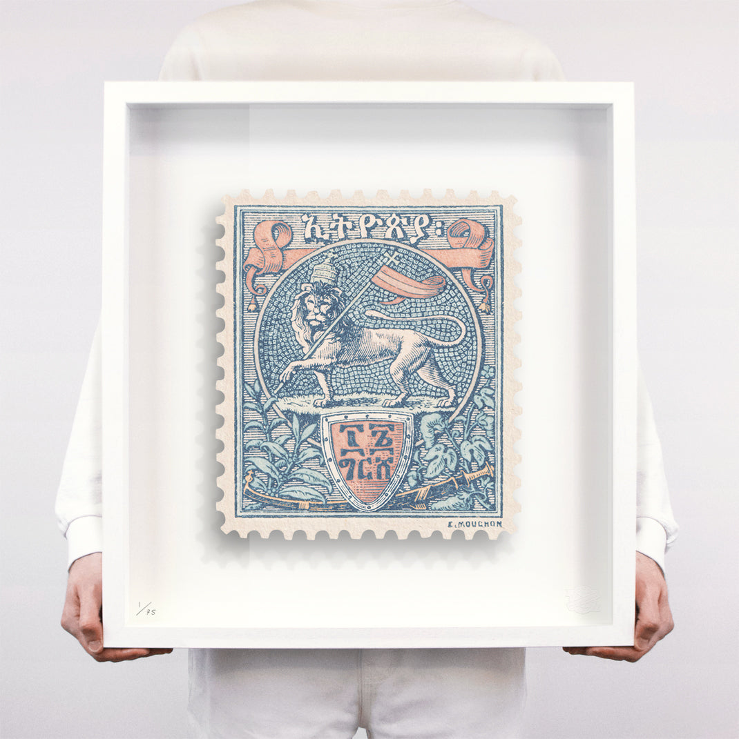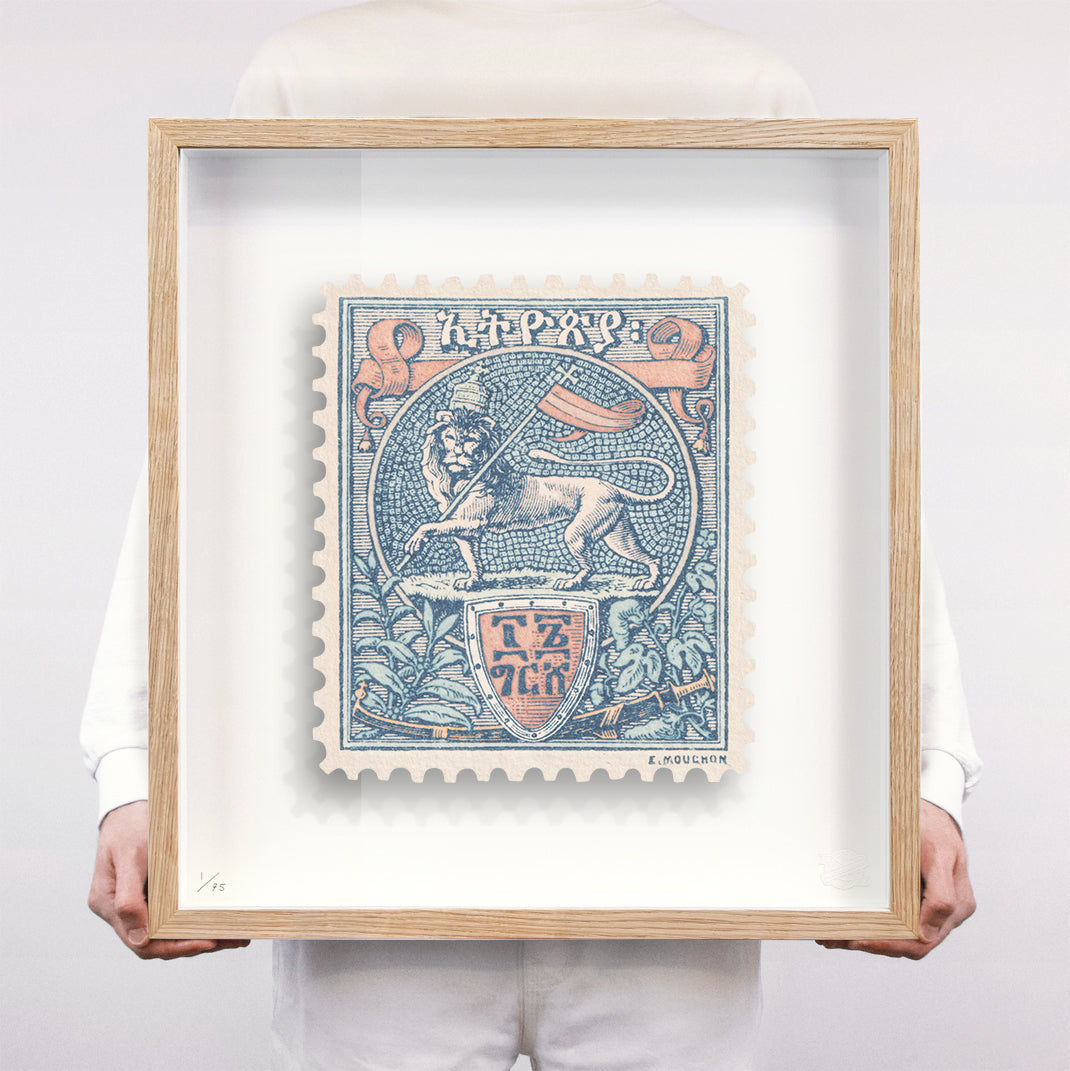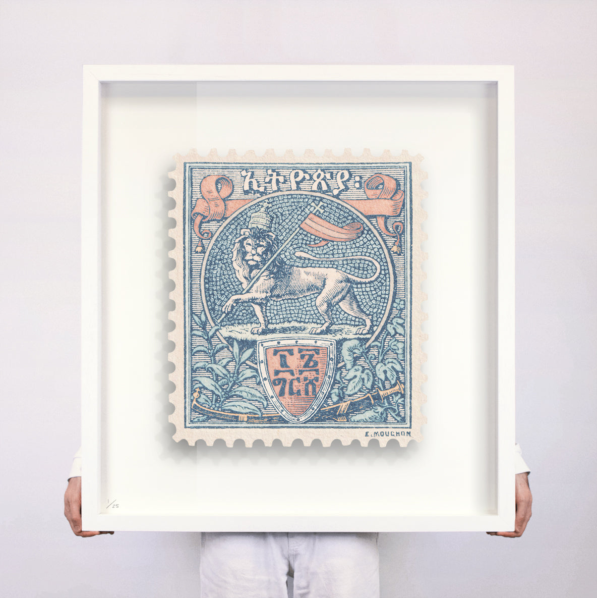Each artwork by Guy Gee has been digitally reimagined from an original postage stamp. Printed on archival mount board, the artwork is then float mounted and editioned. Finally the stamp is housed in one of the studio’s bespoke made box frames by the team.