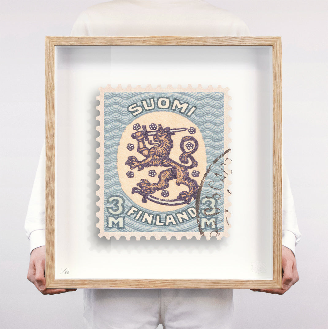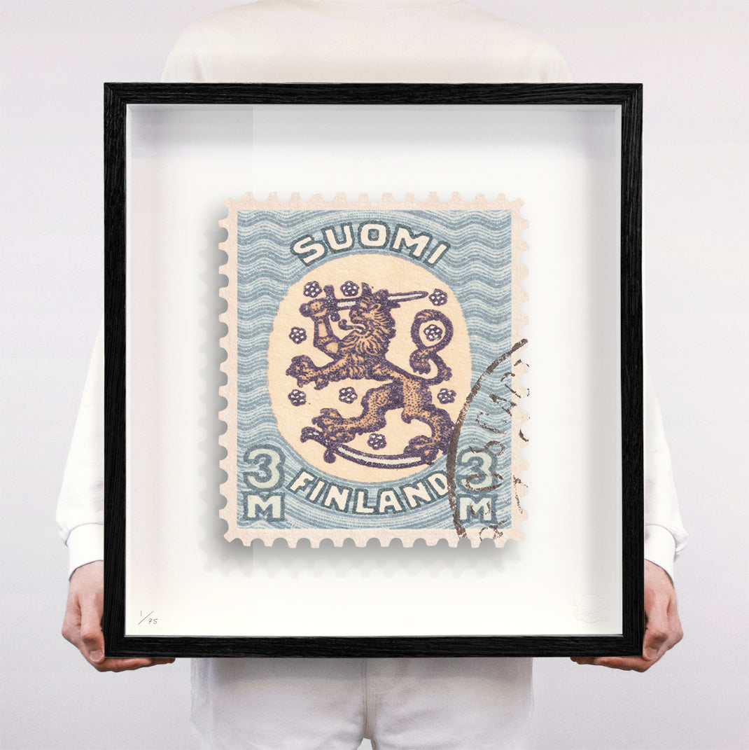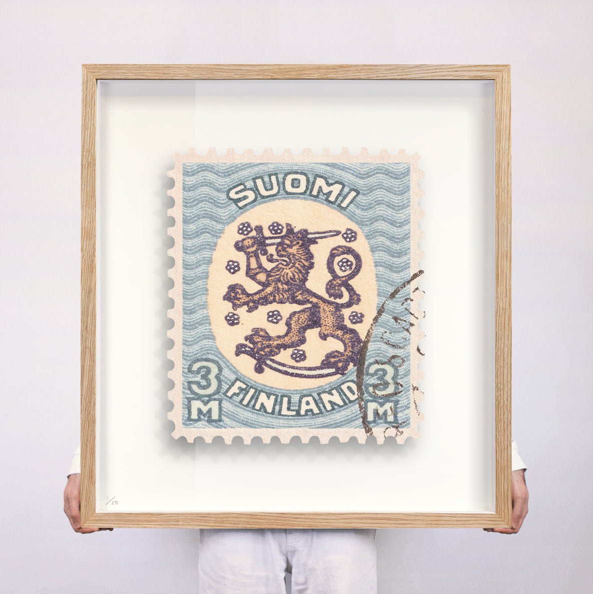 Each artwork by Guy Gee has been digitally reimagined from an original postage stamp. Printed on archival mount board, the artwork is then float mounted and editioned. Finally the stamp is housed in one of the studio’s bespoke made box frames by the team.