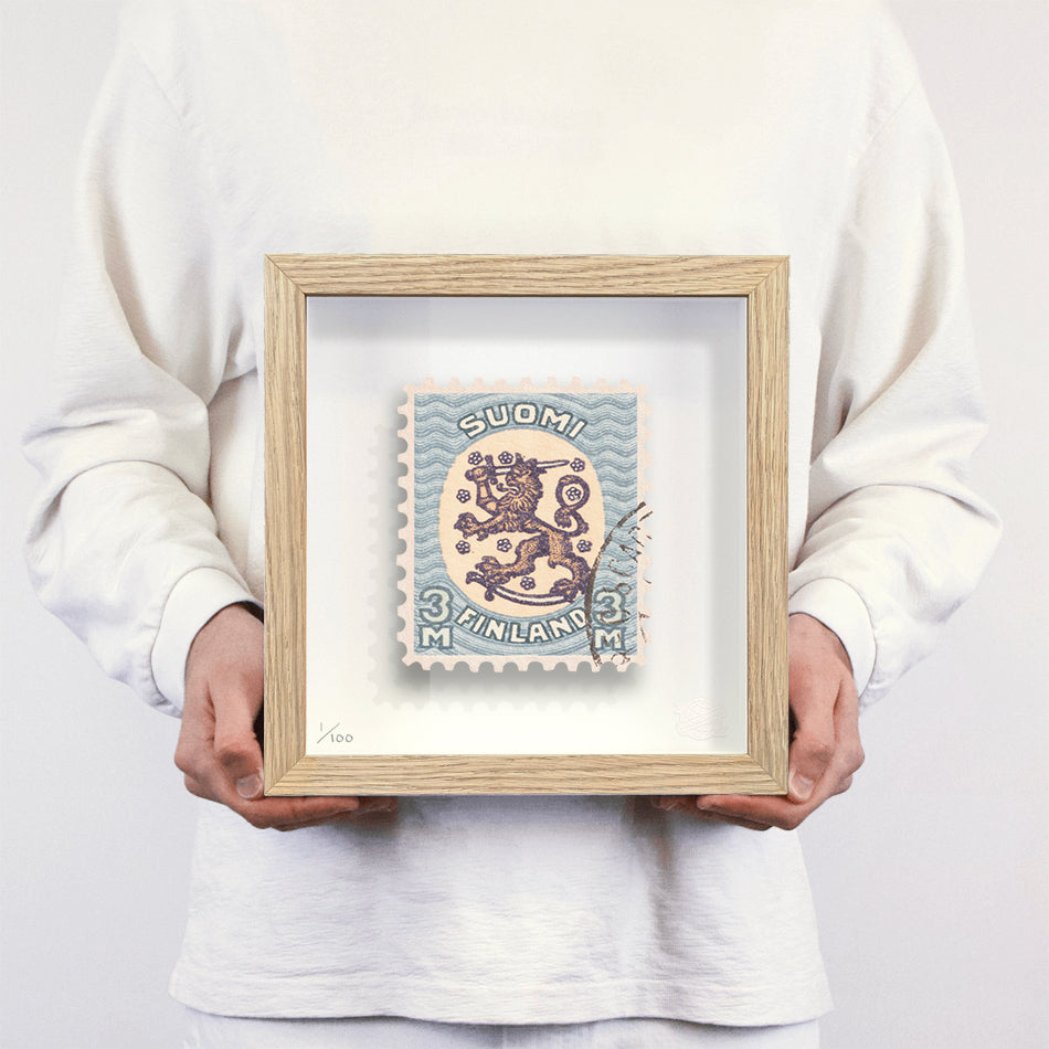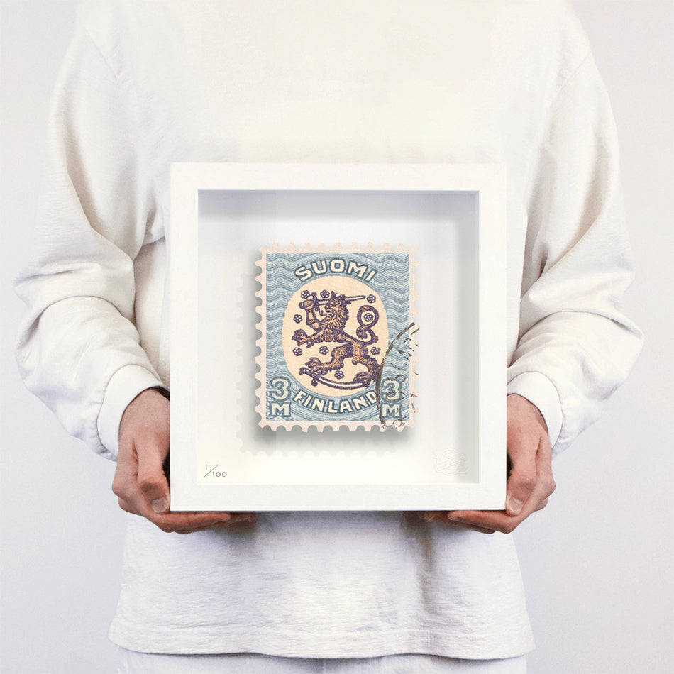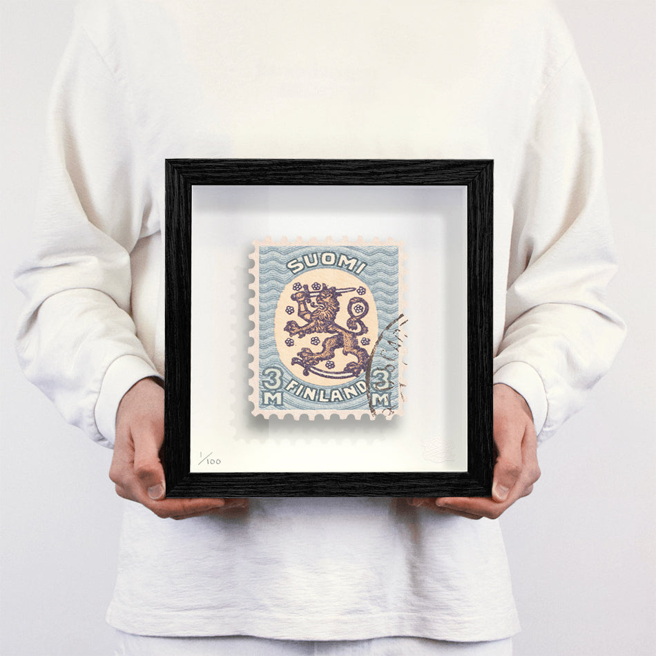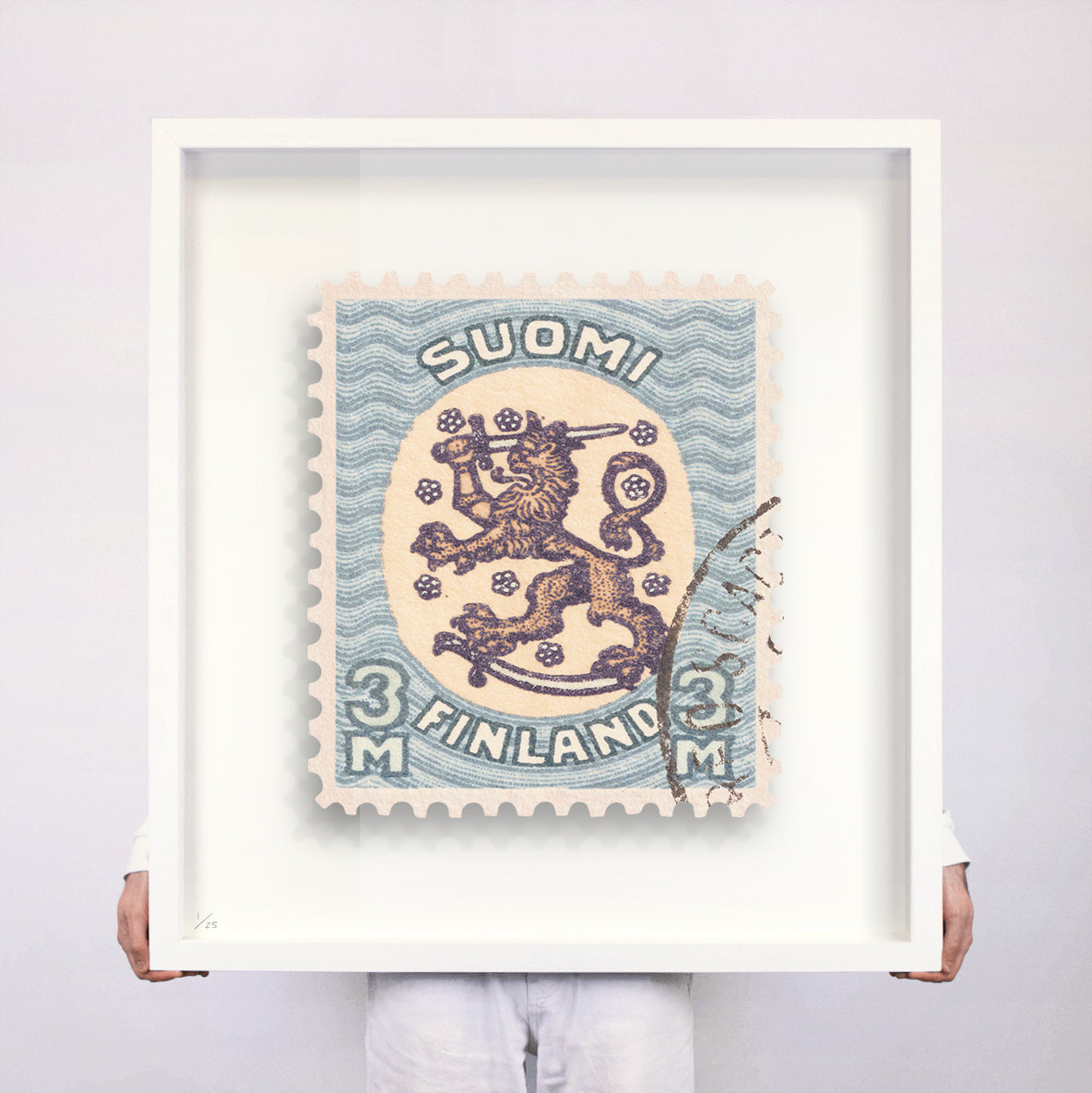 Each artwork by Guy Gee has been digitally reimagined from an original postage stamp. Printed on archival mount board, the artwork is then float mounted and editioned. Finally the stamp is housed in one of the studio’s bespoke made box frames by the team.