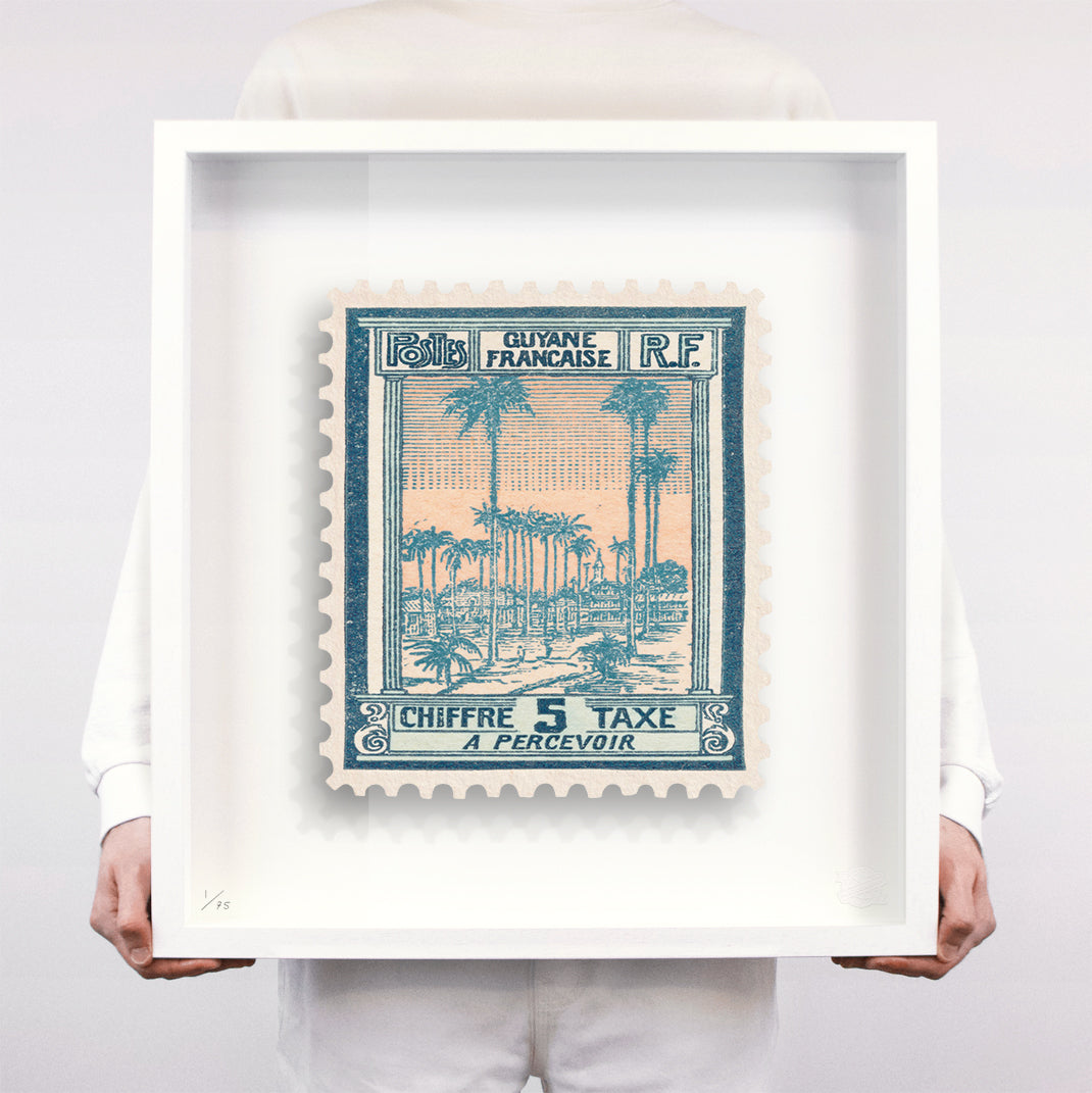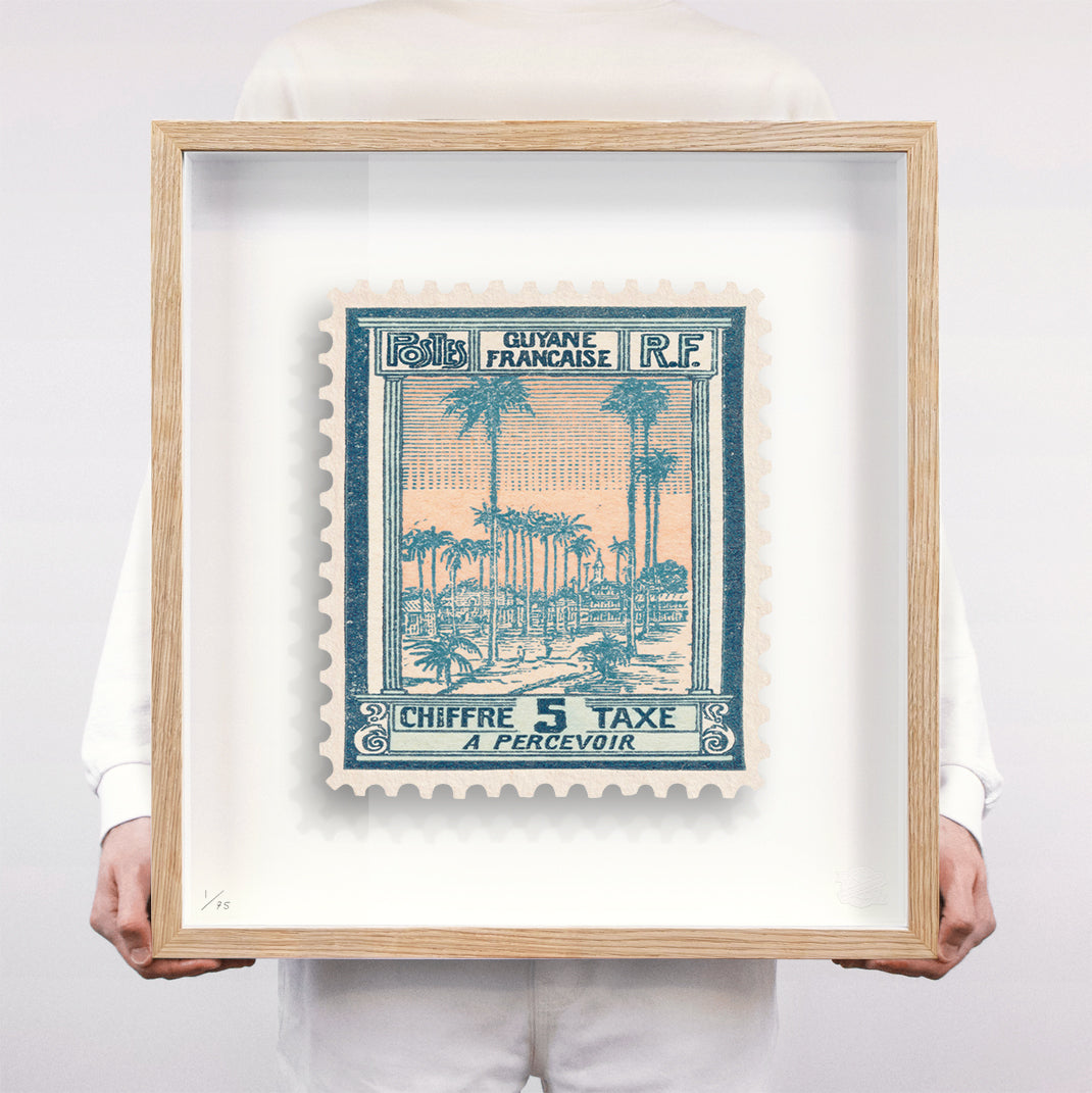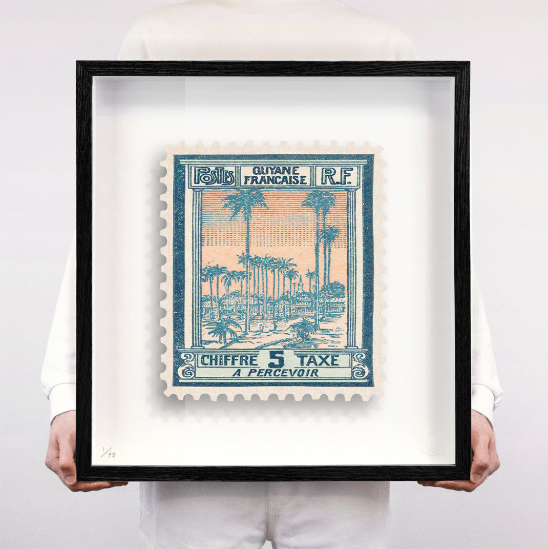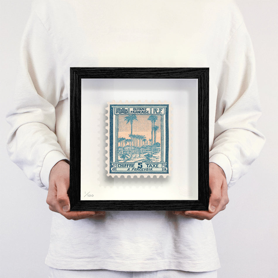 Each artwork by Guy Gee has been digitally reimagined from an original postage stamp. Printed on archival mount board, the artwork is then float mounted and editioned. Finally the stamp is housed in one of the studio’s bespoke made box frames by the team.