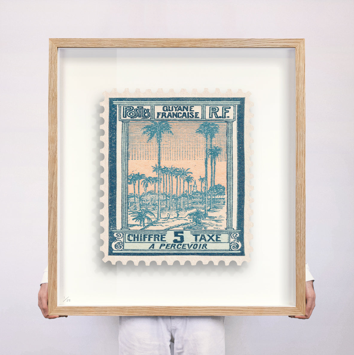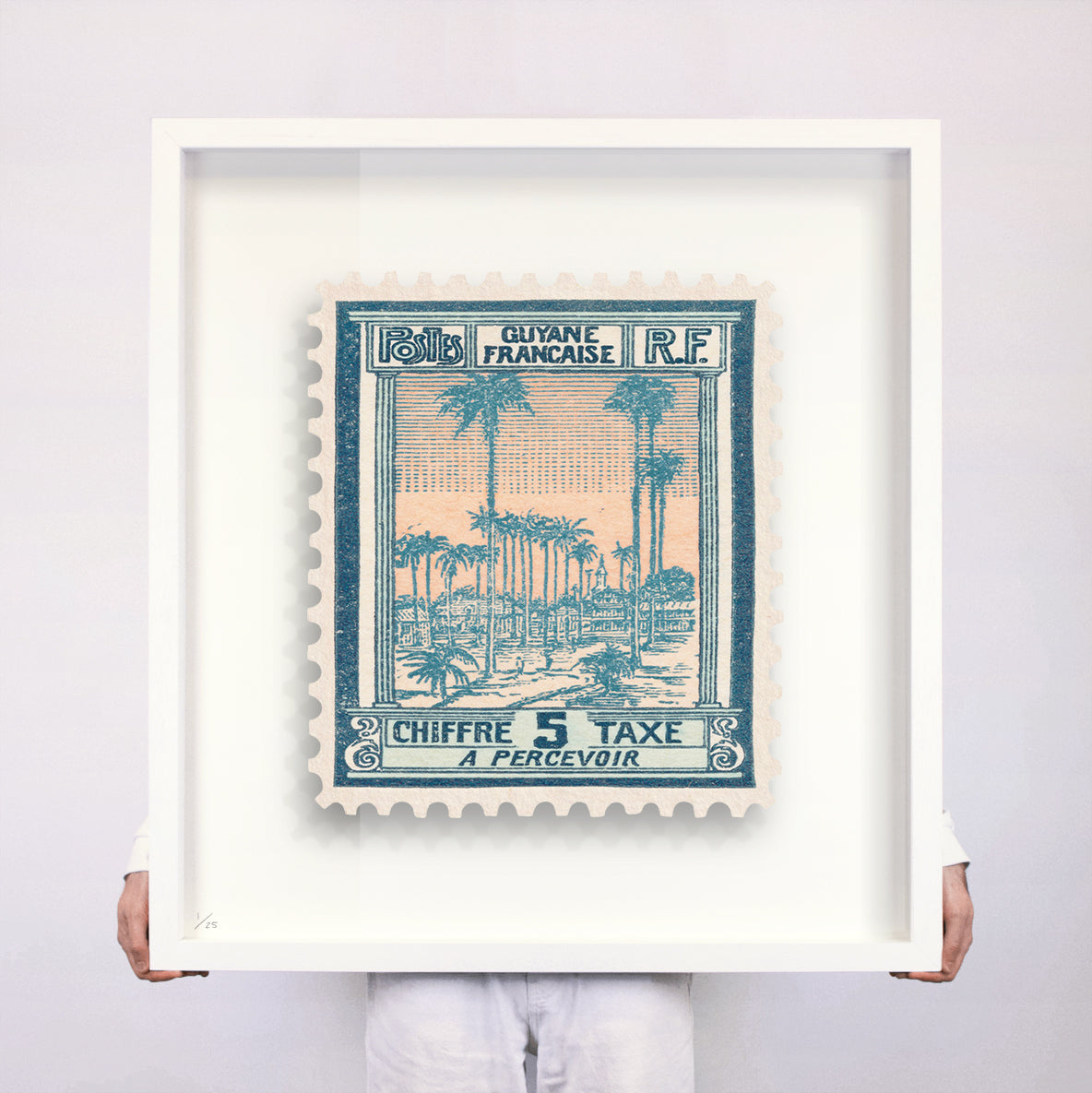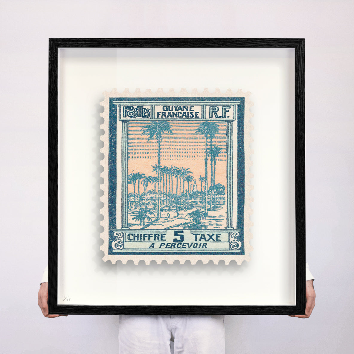 Each artwork by Guy Gee has been digitally reimagined from an original postage stamp. Printed on archival mount board, the artwork is then float mounted and editioned. Finally the stamp is housed in one of the studio’s bespoke made box frames by the team.