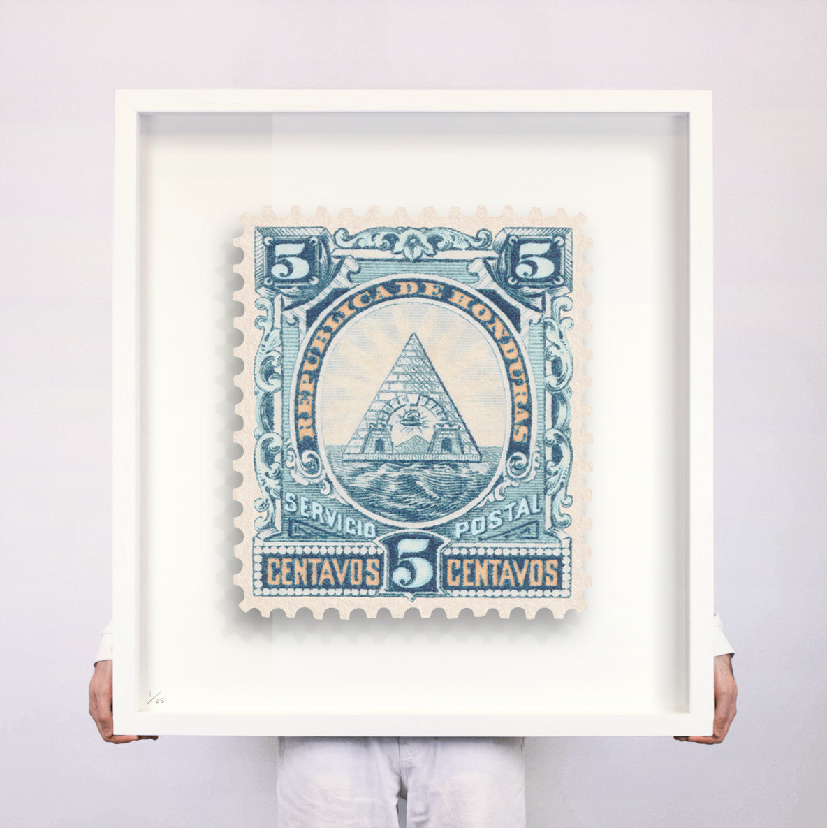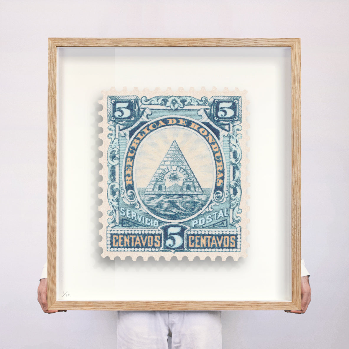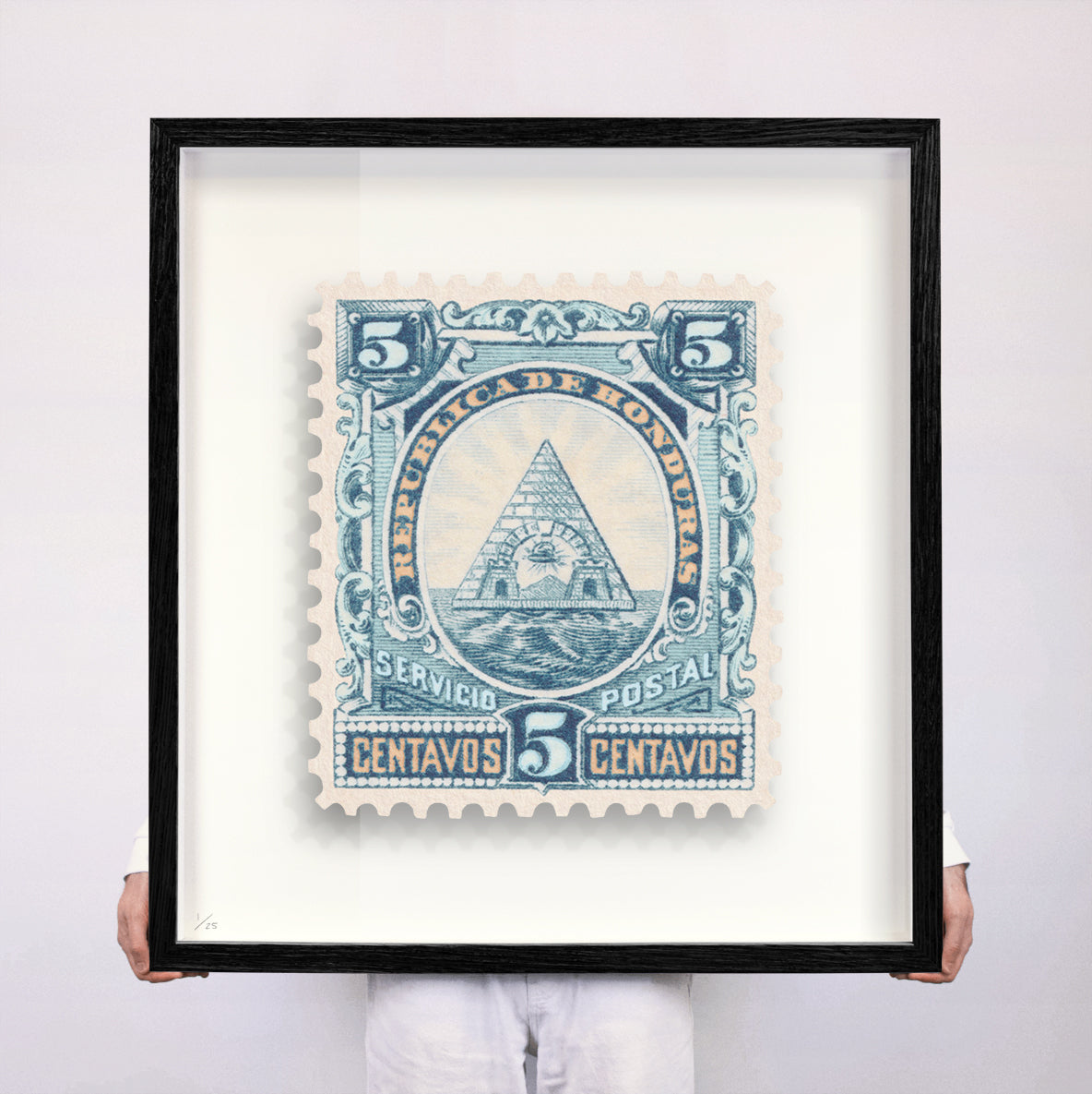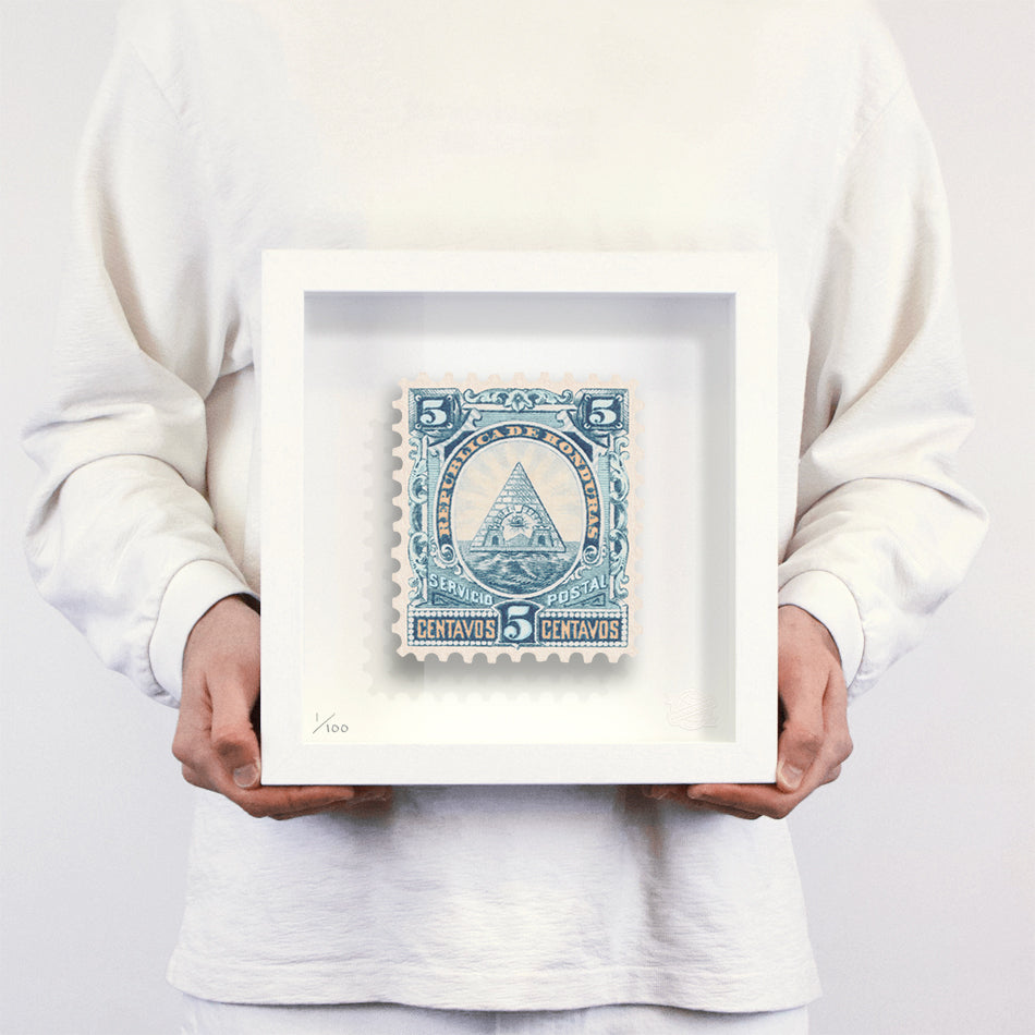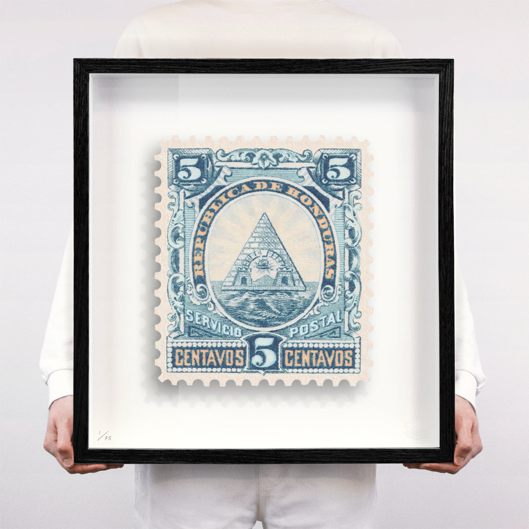 Each artwork by Guy Gee has been digitally reimagined from an original postage stamp. Printed on archival mount board, the artwork is then float mounted and editioned. Finally the stamp is housed in one of the studio’s bespoke made box frames by the team.