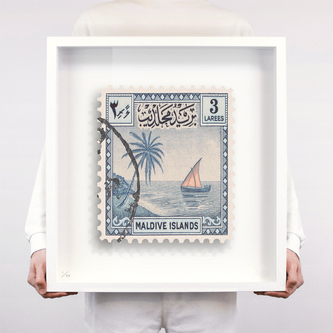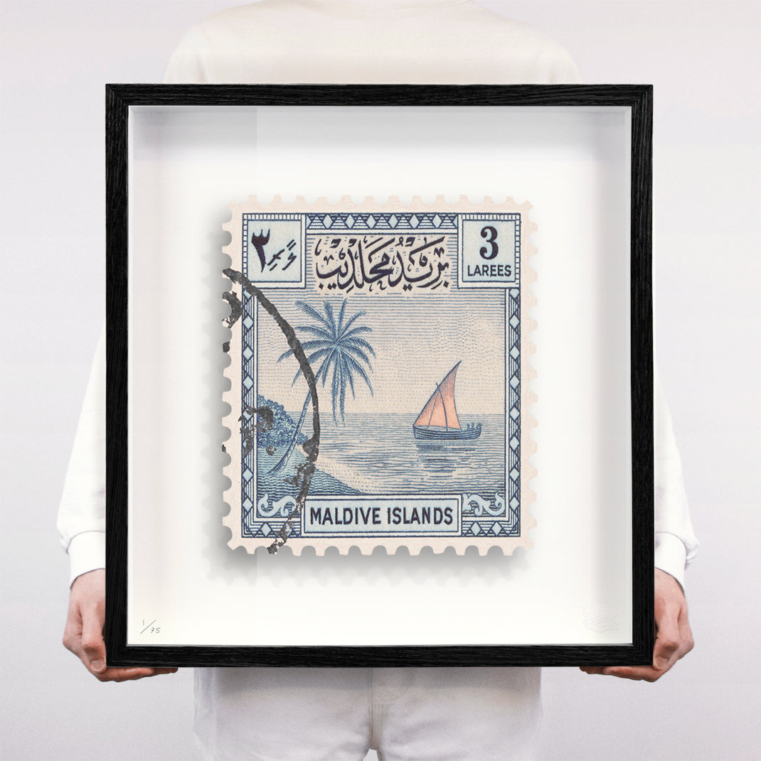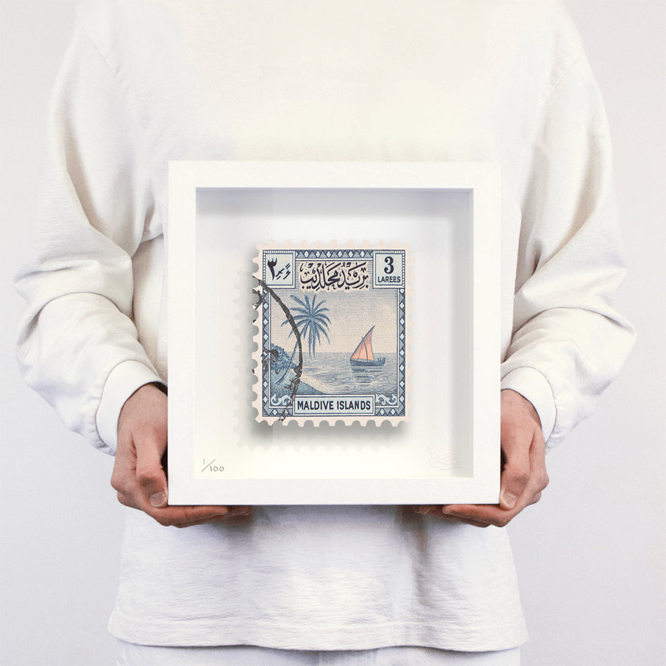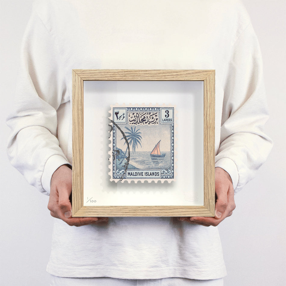 Each artwork by Guy Gee has been digitally reimagined from an original postage stamp. Printed on archival mount board, the artwork is then float mounted and editioned. Finally the stamp is housed in one of the studio’s bespoke made box frames by the team.