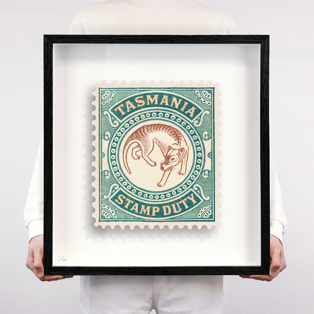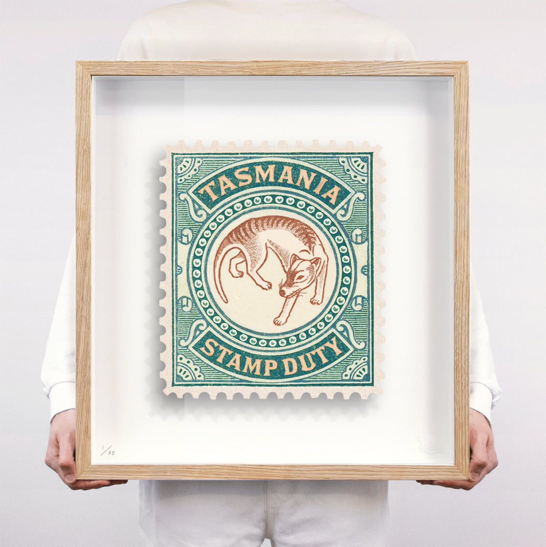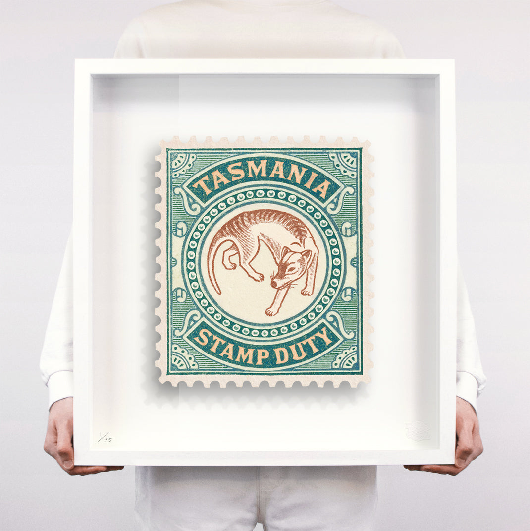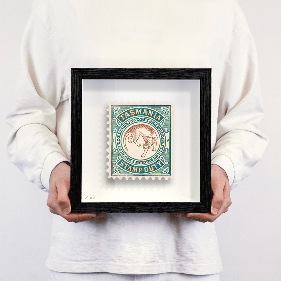 Each artwork by Guy Gee has been digitally reimagined from an original postage stamp. Printed on archival mount board, the artwork is then float mounted and editioned. Finally the stamp is housed in one of the studio’s bespoke made box frames by the team.
