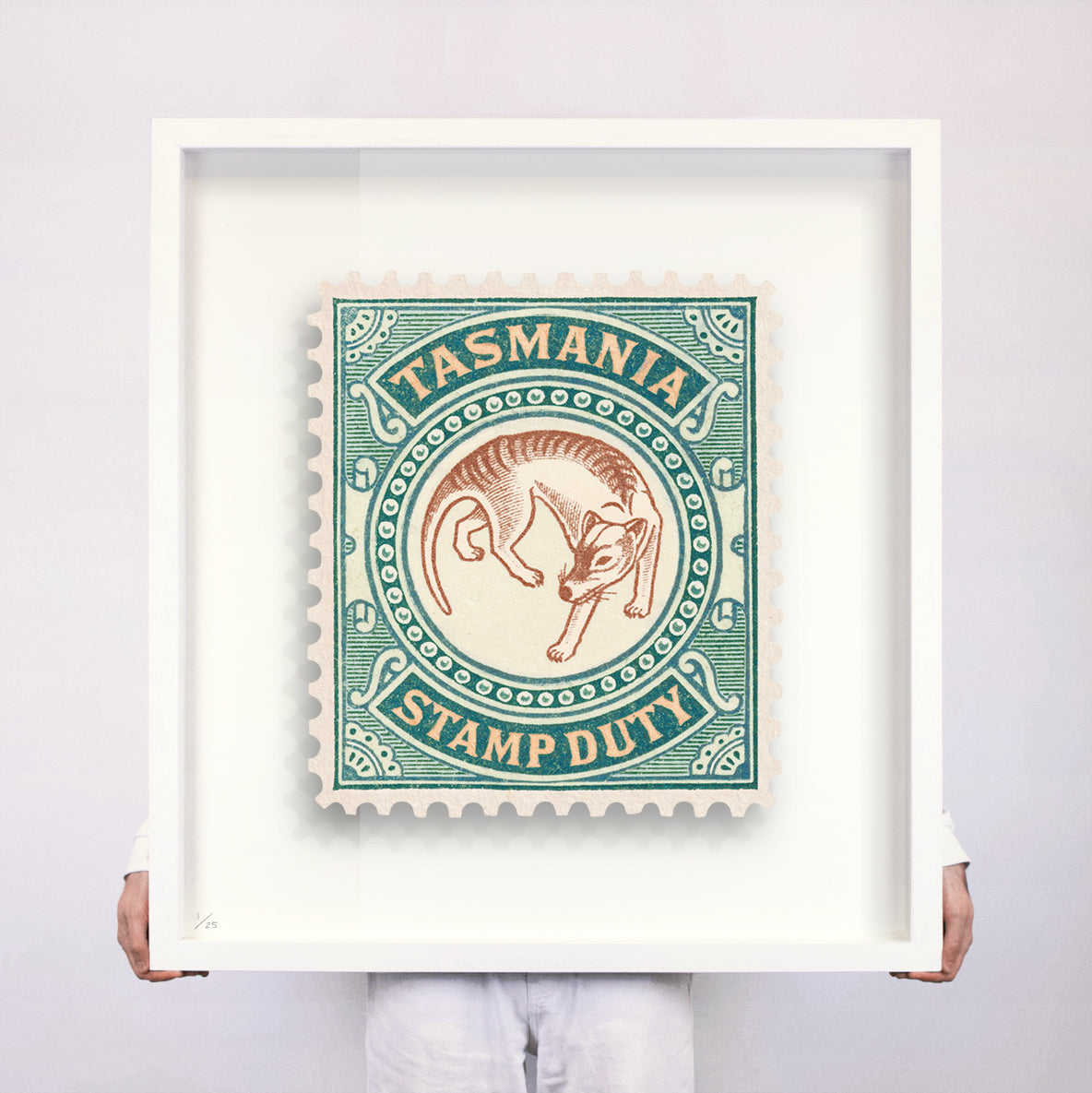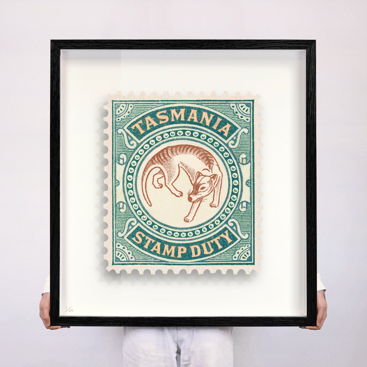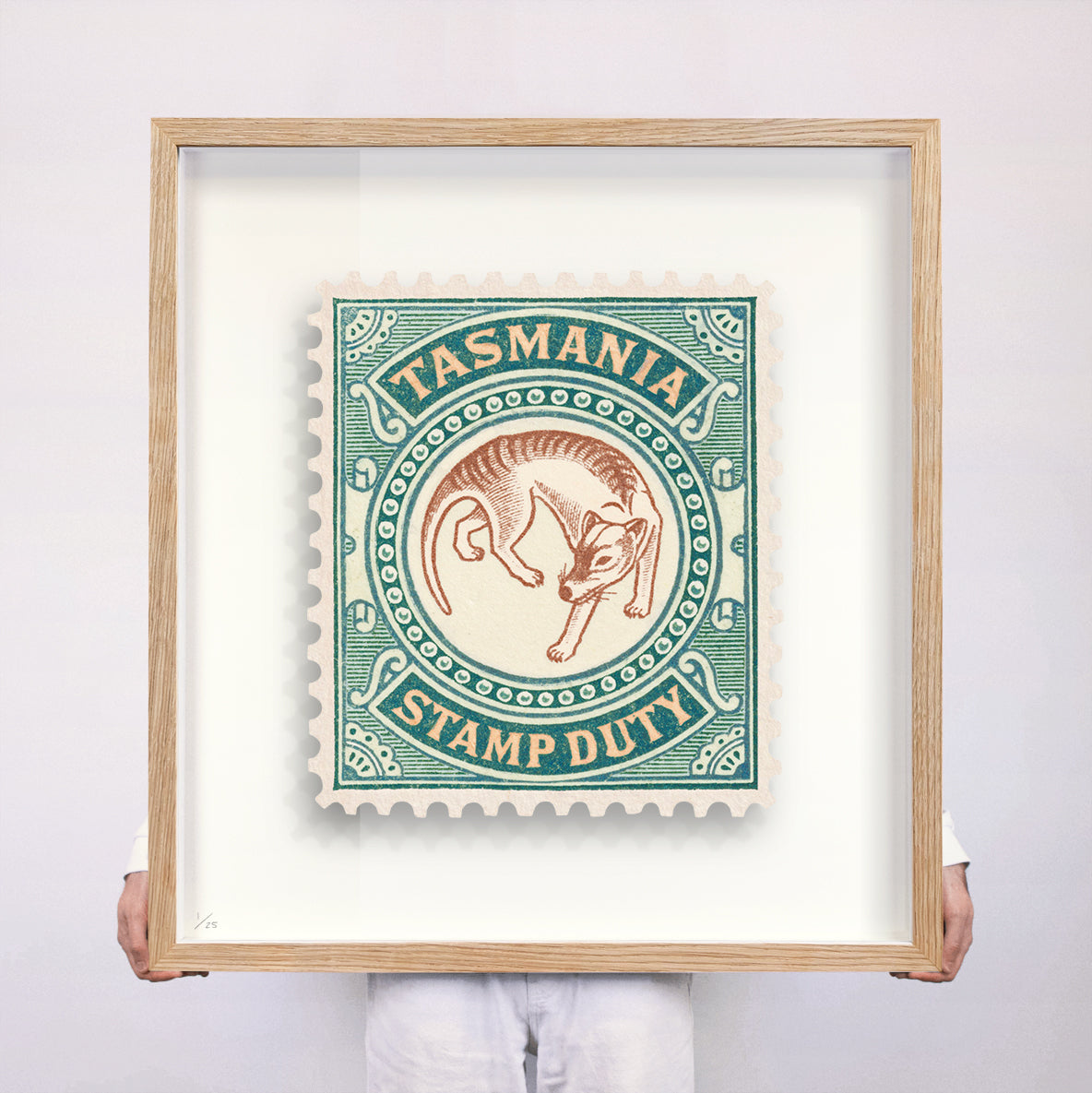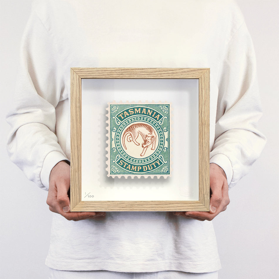 Each artwork by Guy Gee has been digitally reimagined from an original postage stamp. Printed on archival mount board, the artwork is then float mounted and editioned. Finally the stamp is housed in one of the studio’s bespoke made box frames by the team.