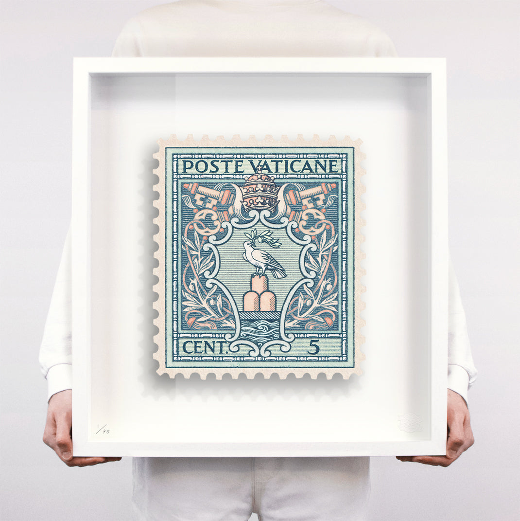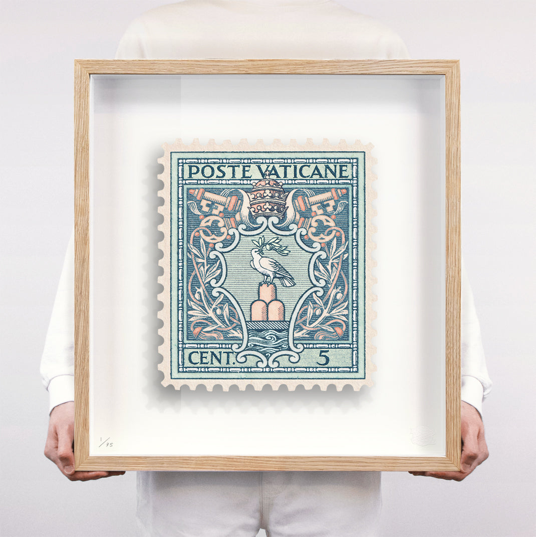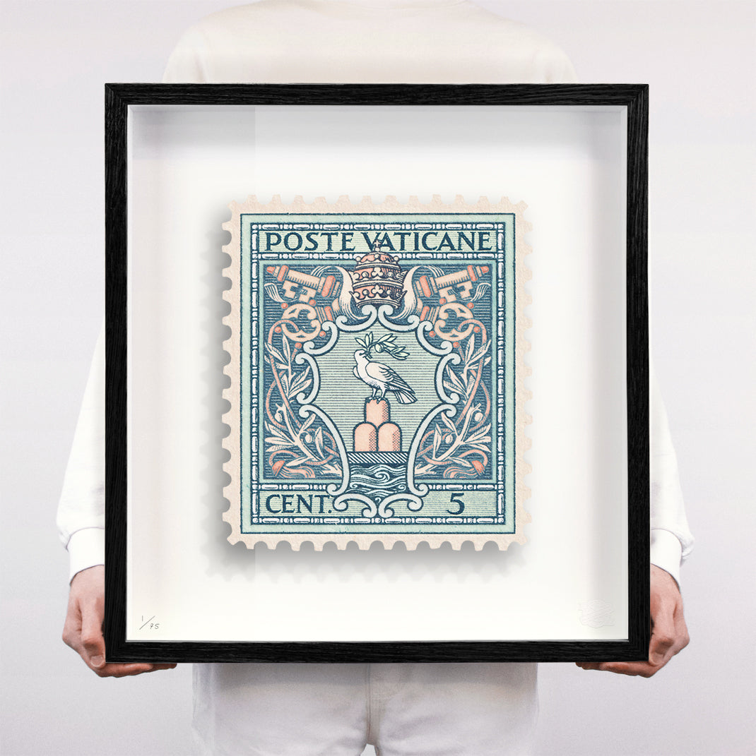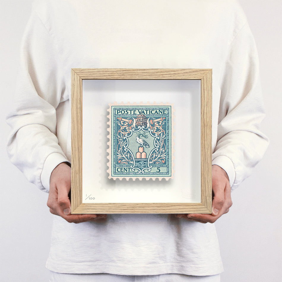 Each artwork by Guy Gee has been digitally reimagined from an original postage stamp. Printed on archival mount board, the artwork is then float mounted and editioned. Finally the stamp is housed in one of the studio’s bespoke made box frames by the team.