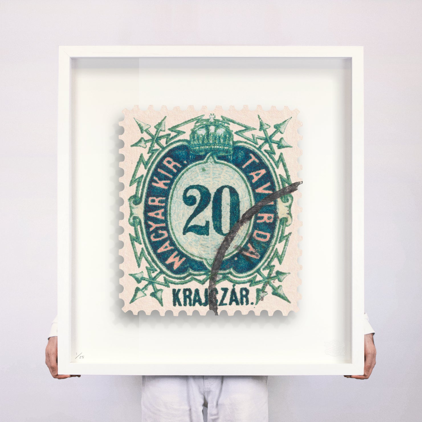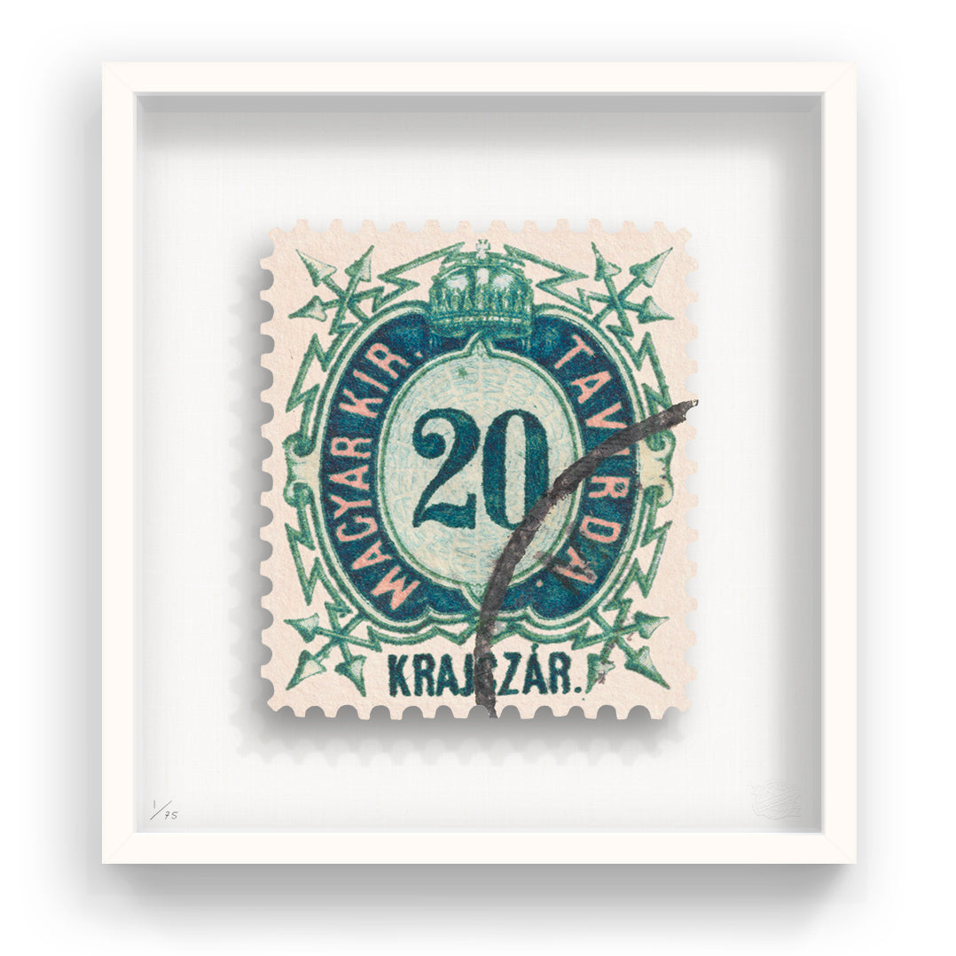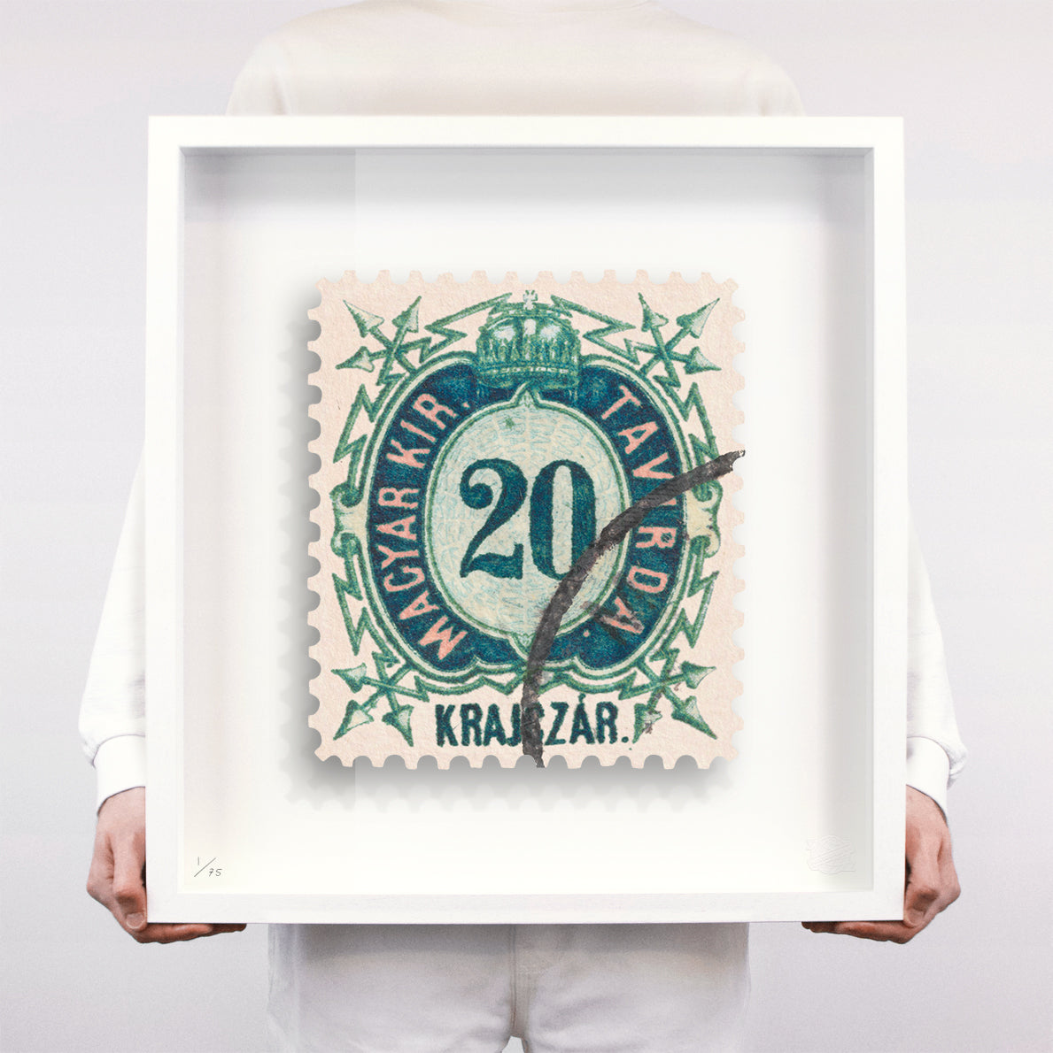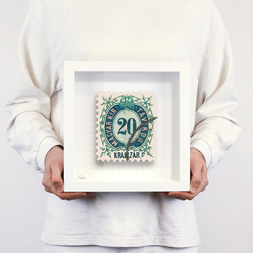Each artwork by Guy Gee has been digitally reimagined from an original postage stamp. Printed on archival mount board, the artwork is then float mounted and editioned. Finally the stamp is housed in one of the studio’s bespoke made box frames by the team.