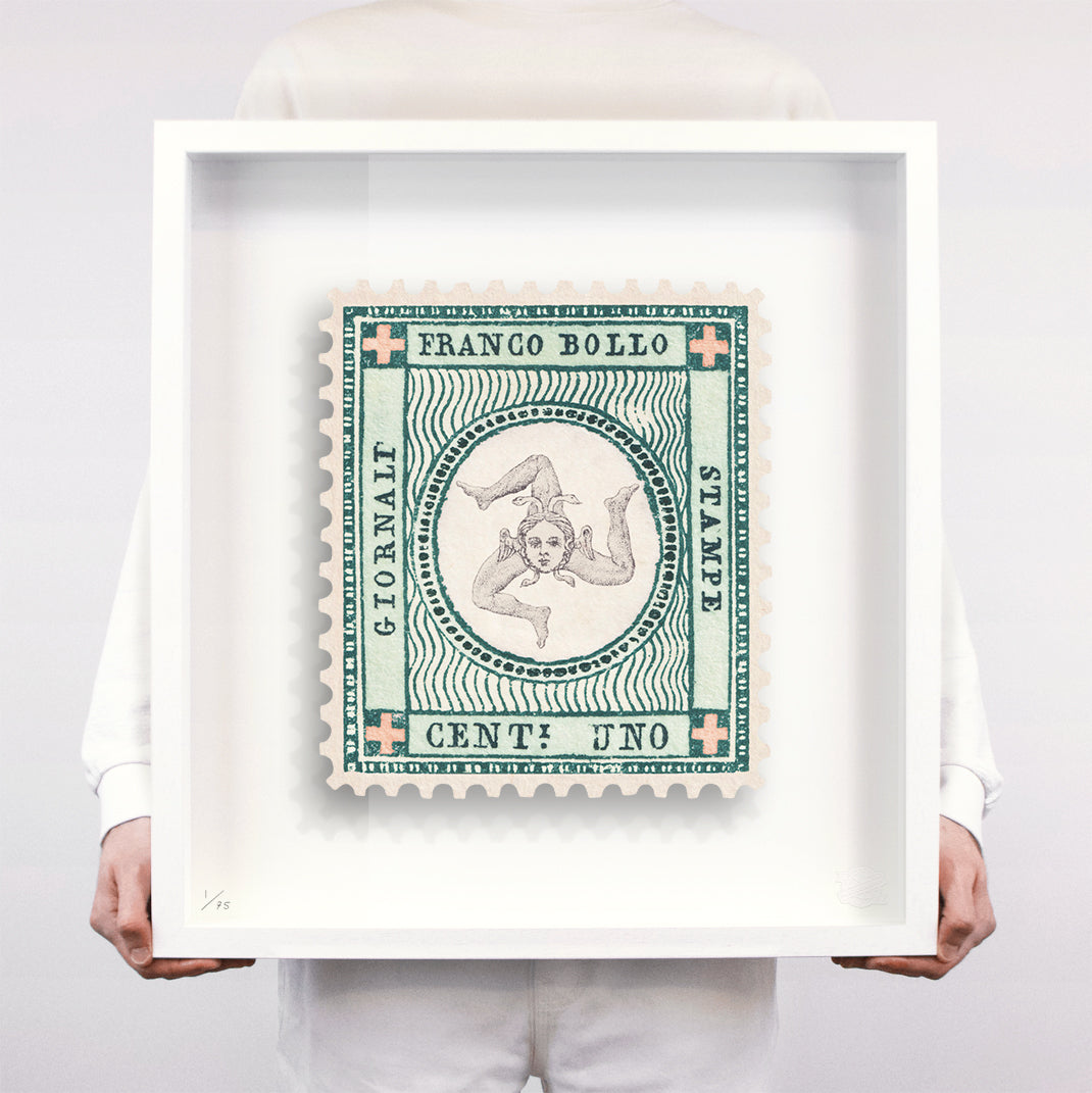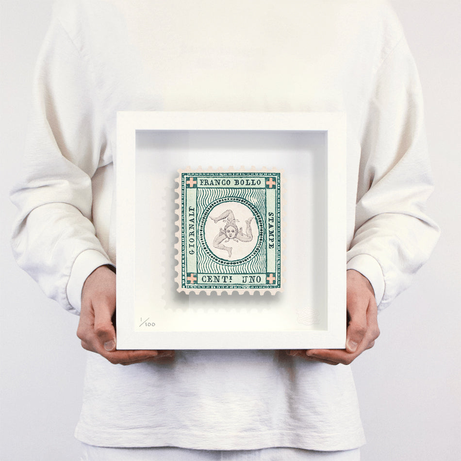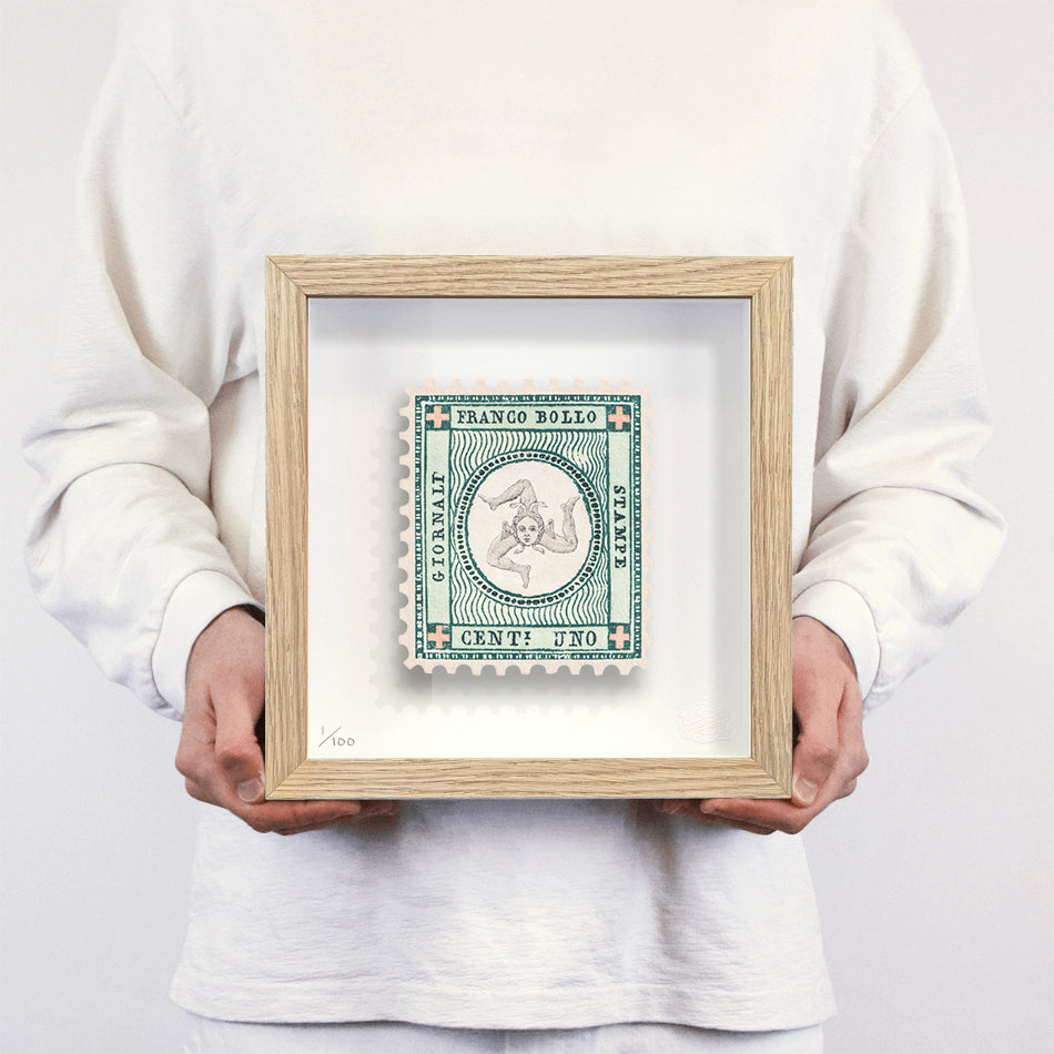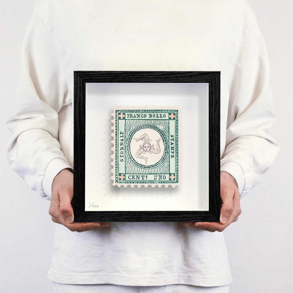 Each artwork by Guy Gee has been digitally reimagined from an original postage stamp. Printed on archival mount board, the artwork is then float mounted and editioned. Finally the stamp is housed in one of the studio’s bespoke made box frames by the team.