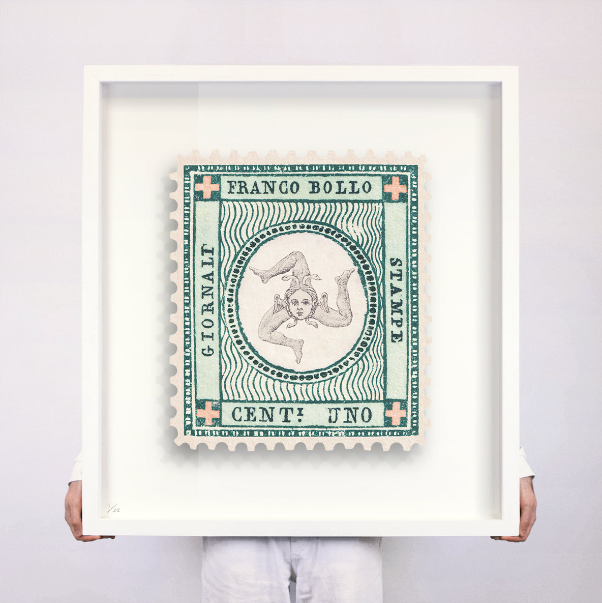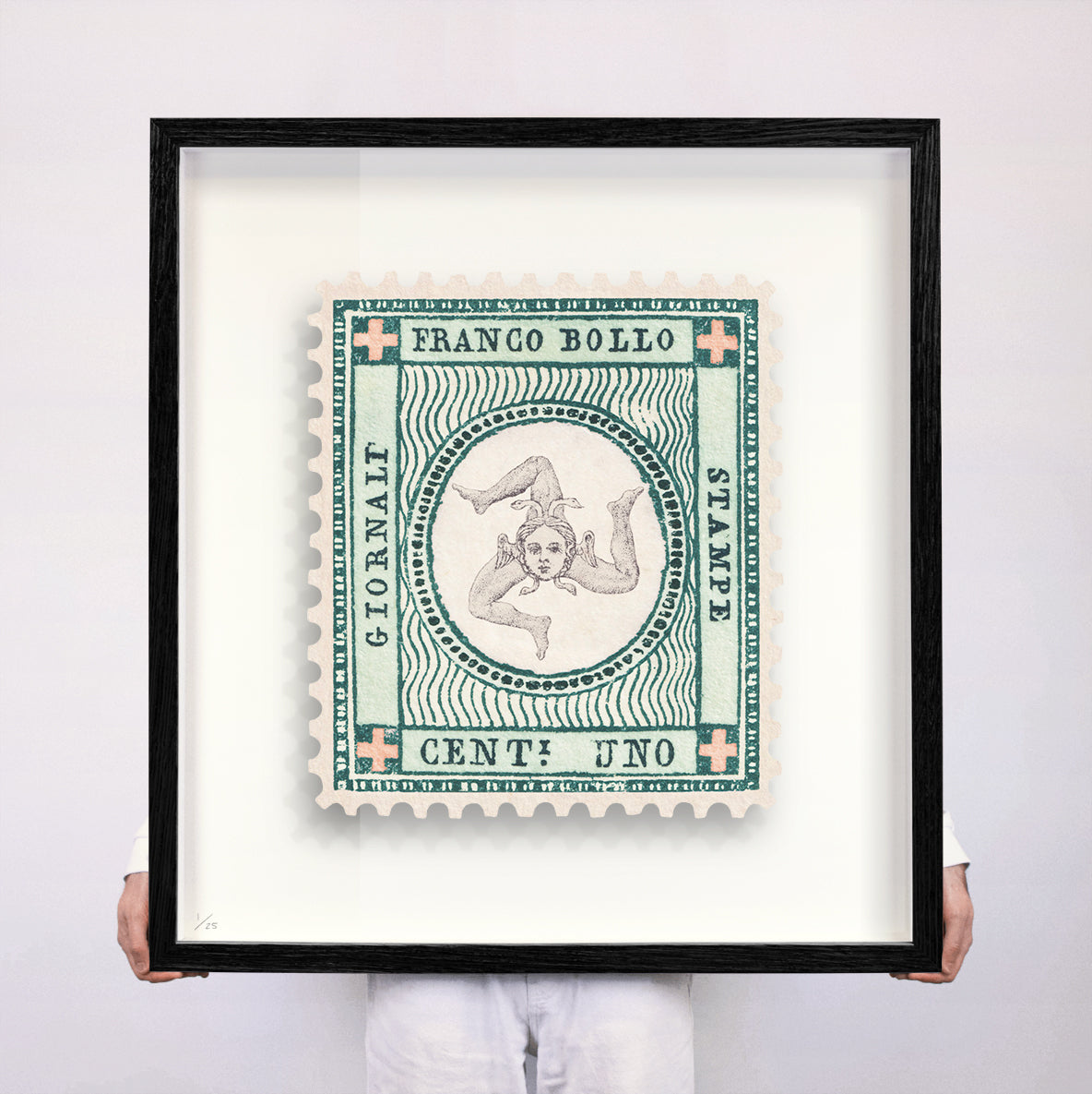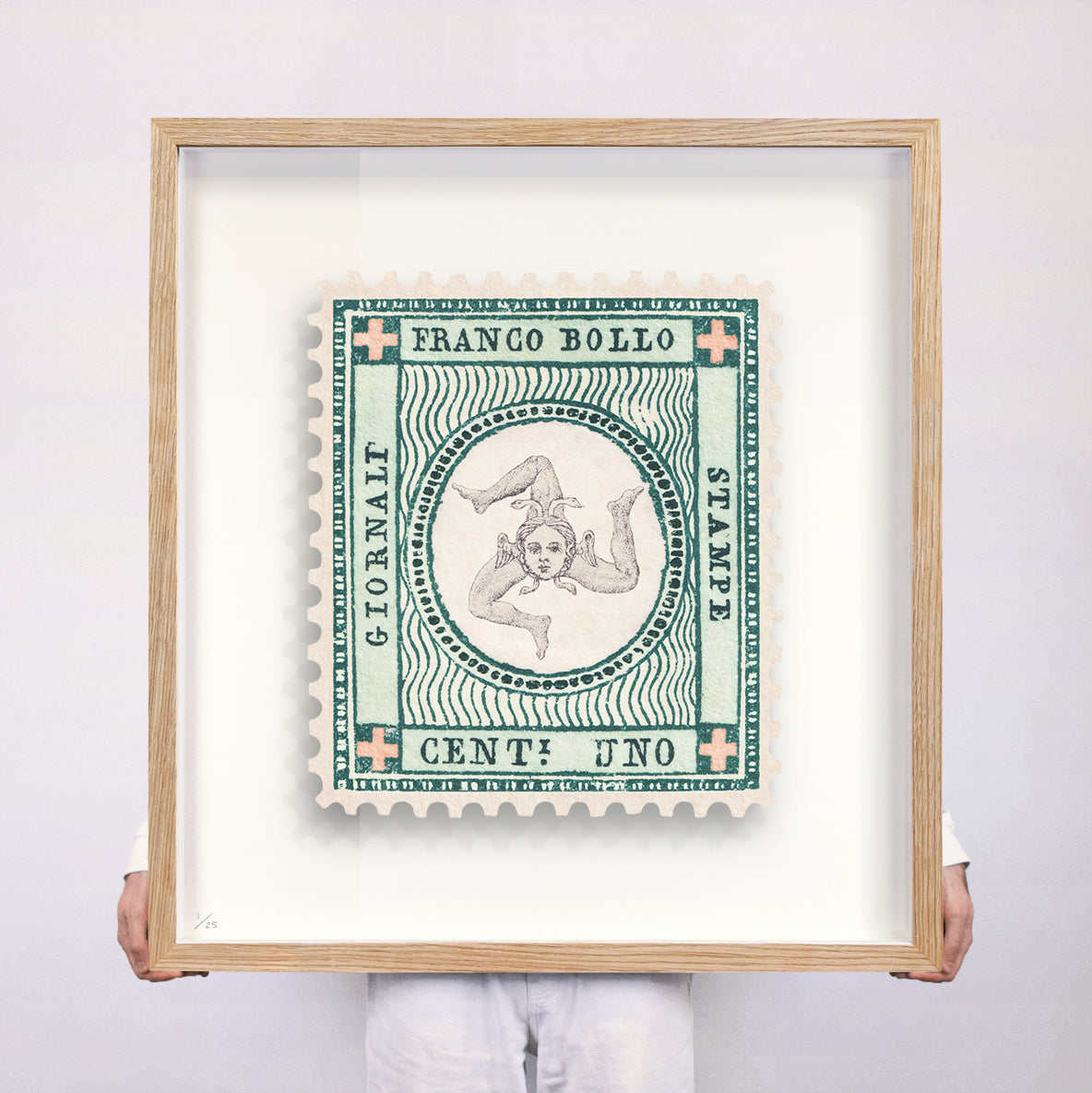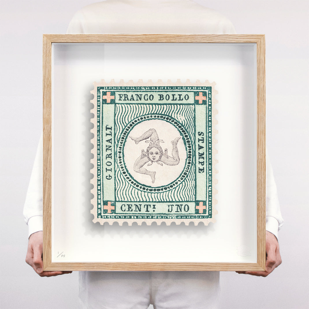 Each artwork by Guy Gee has been digitally reimagined from an original postage stamp. Printed on archival mount board, the artwork is then float mounted and editioned. Finally the stamp is housed in one of the studio’s bespoke made box frames by the team.