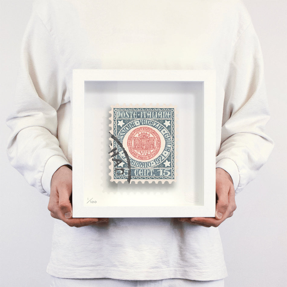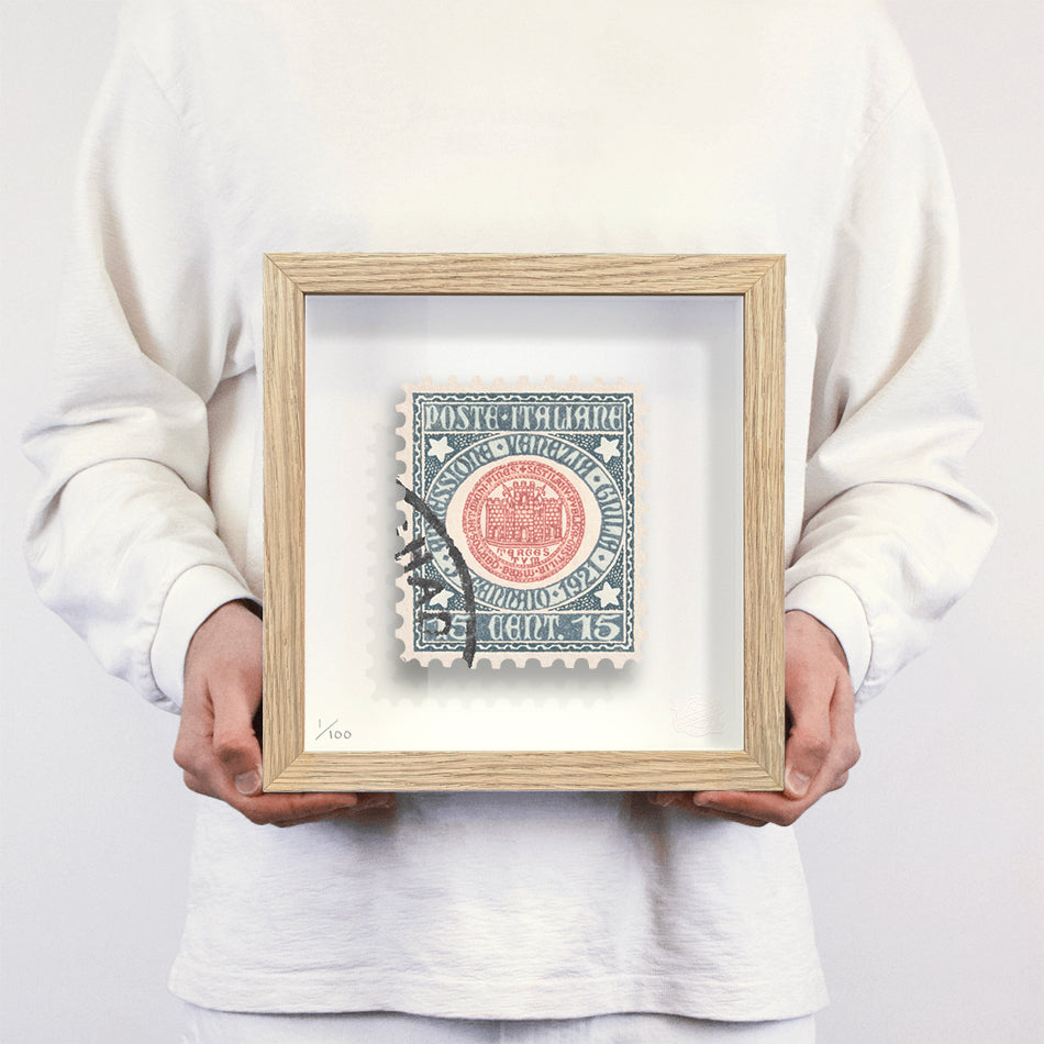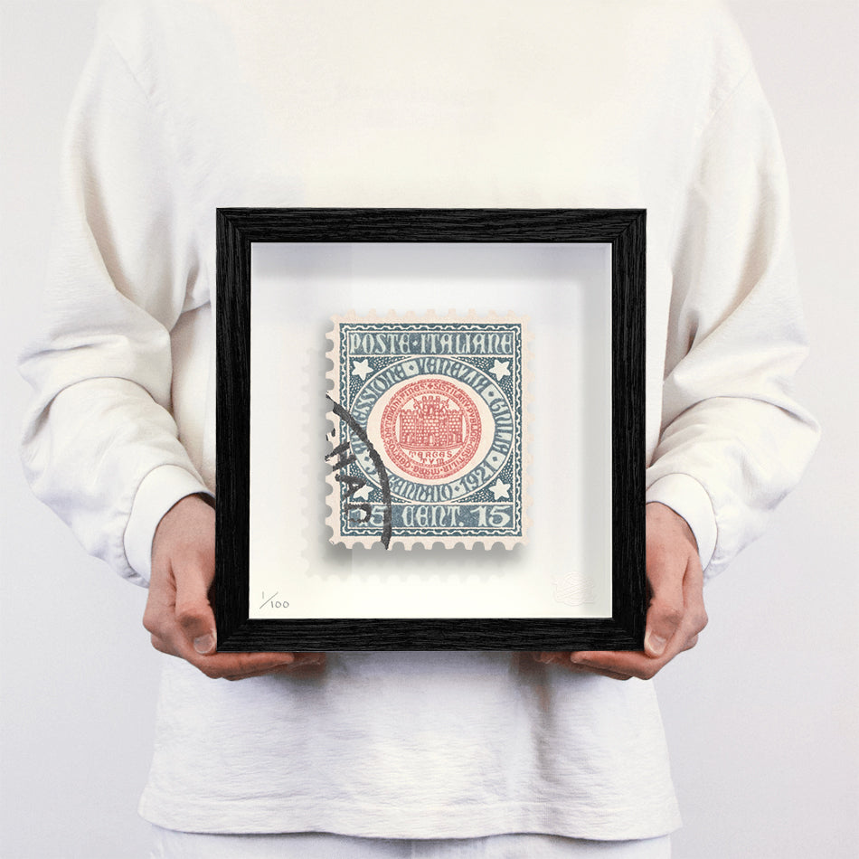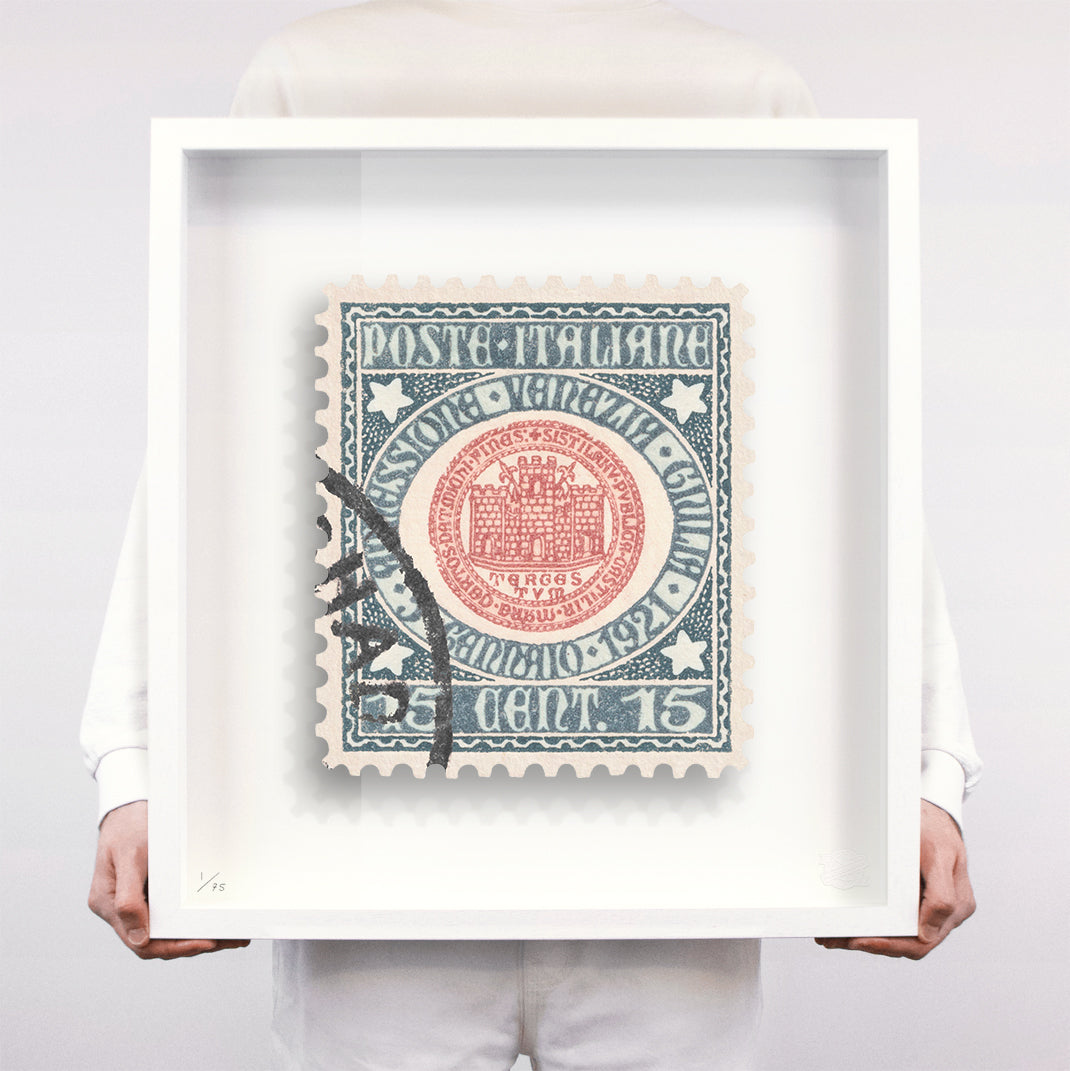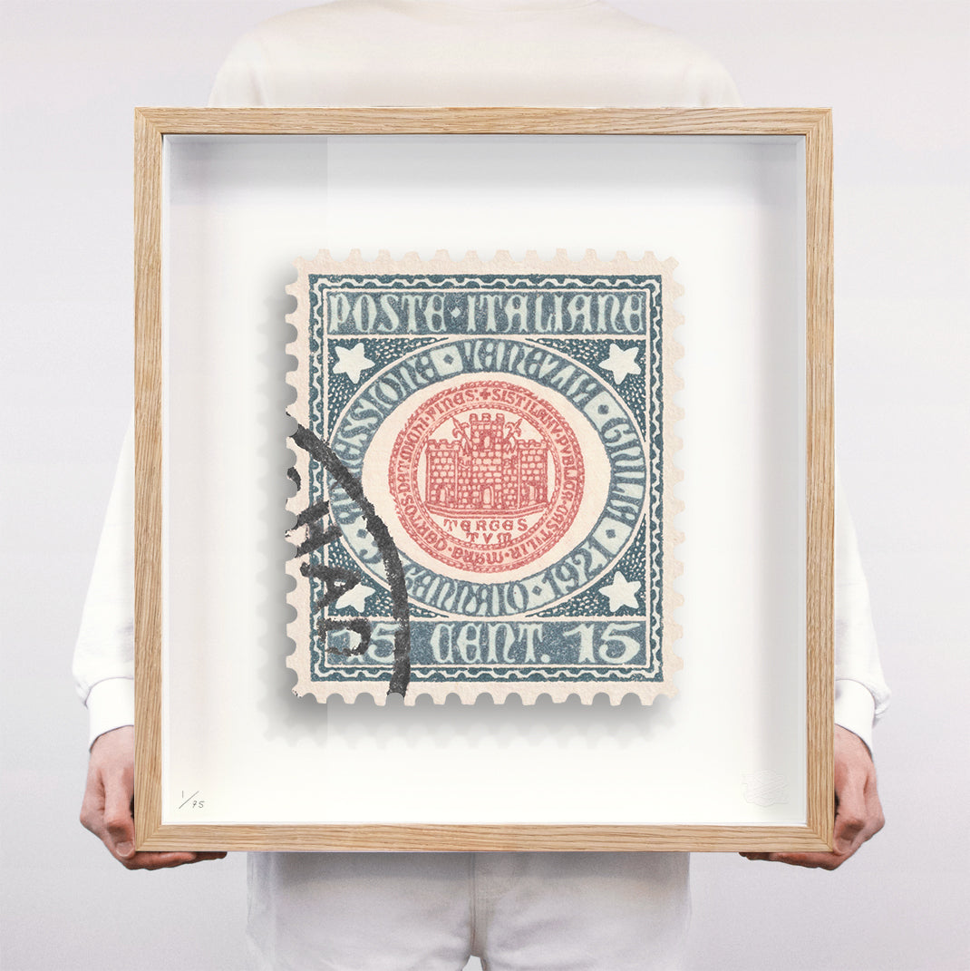Each artwork by Guy Gee has been digitally reimagined from an original postage stamp. Printed on archival mount board, the artwork is then float mounted and editioned. Finally the stamp is housed in one of the studio’s bespoke made box frames by the team.