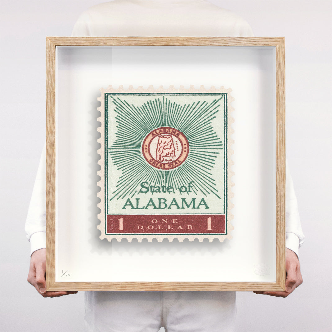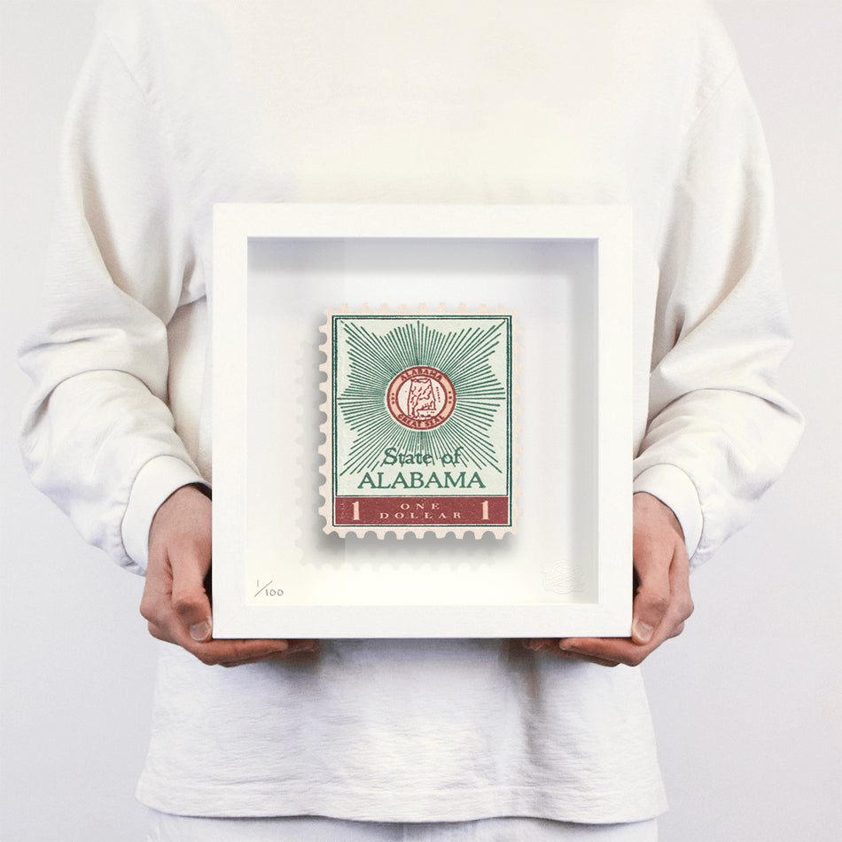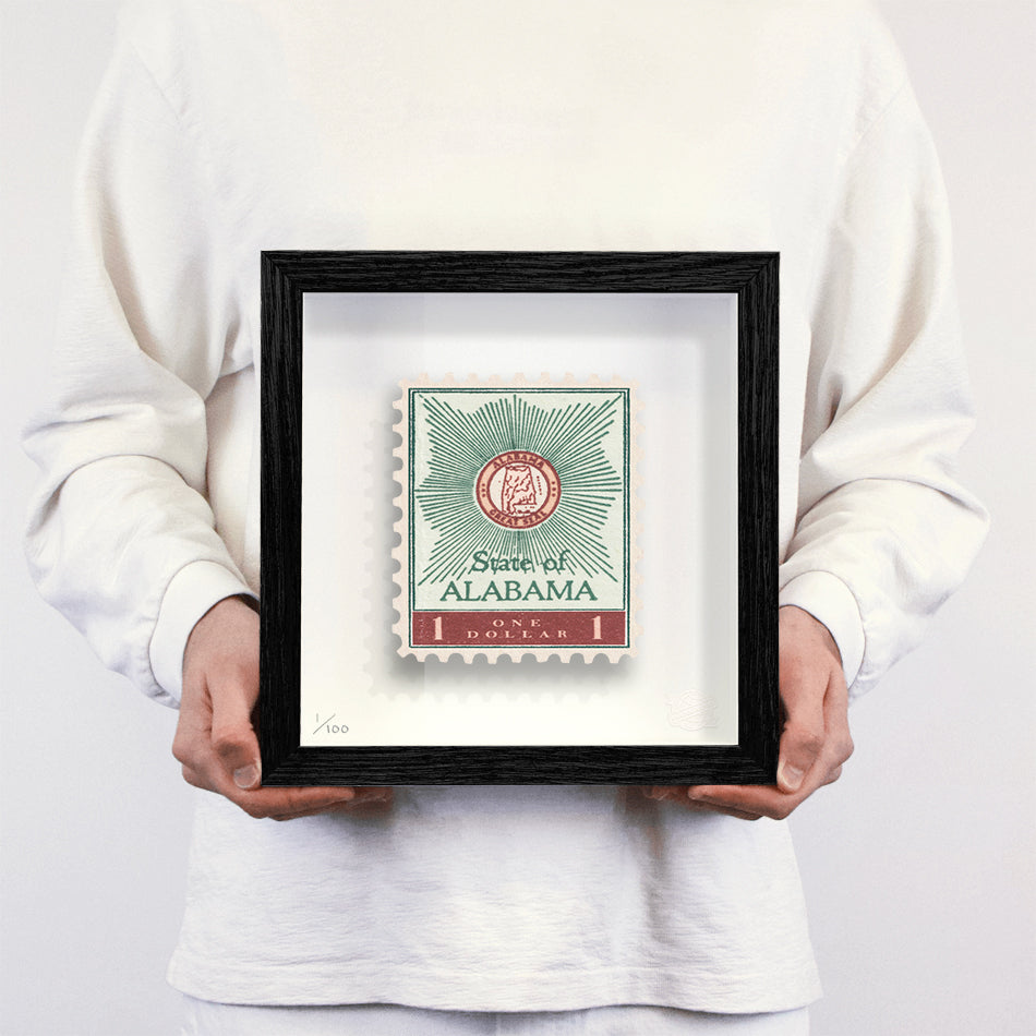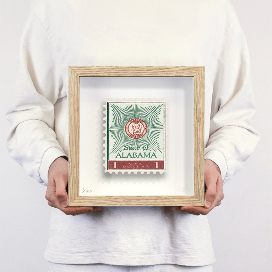 Each artwork by GuyGee has been digitally reimagined from an original postage stamp. Printed on archival mount board, the artwork is then float mounted and editioned. Finally the stamp is housed in one of the studio’s bespoke made box frames by the team.