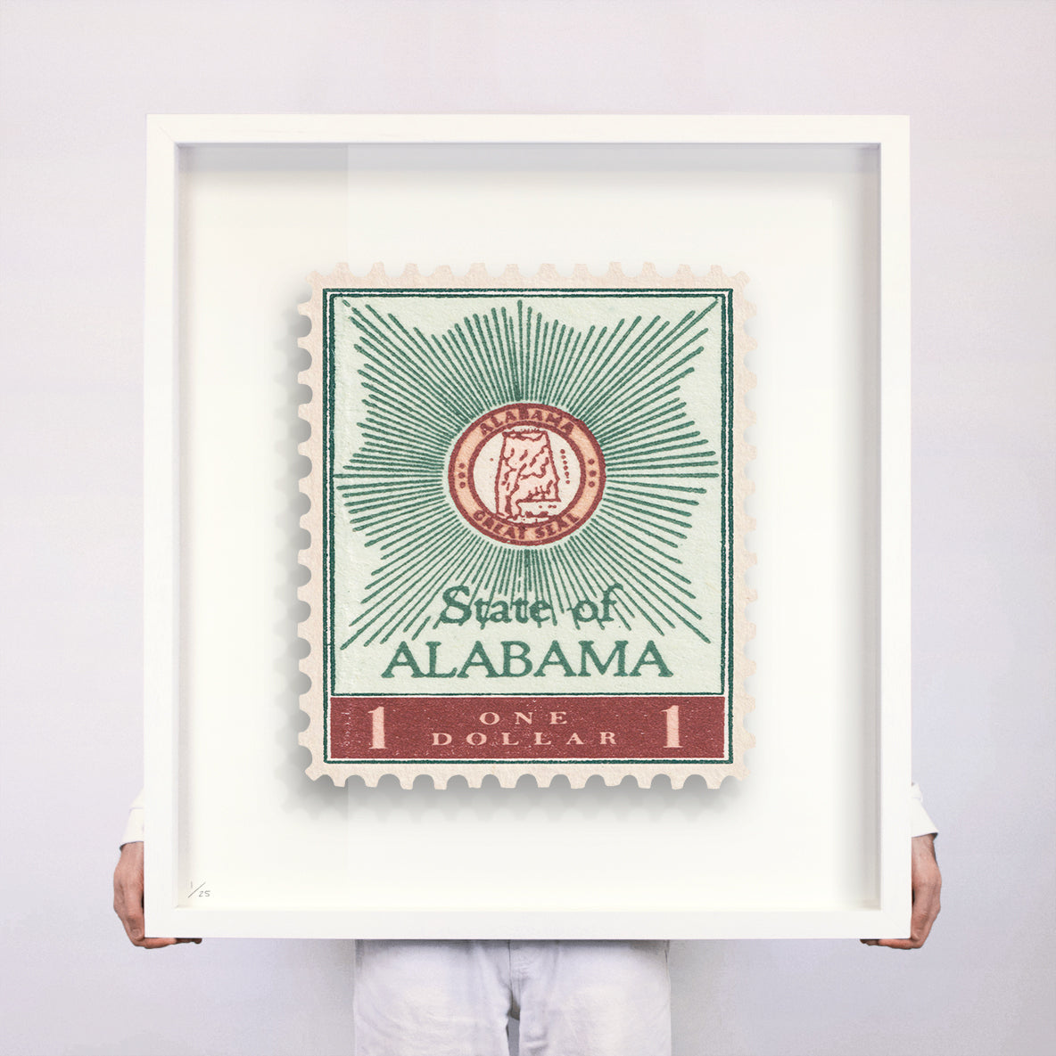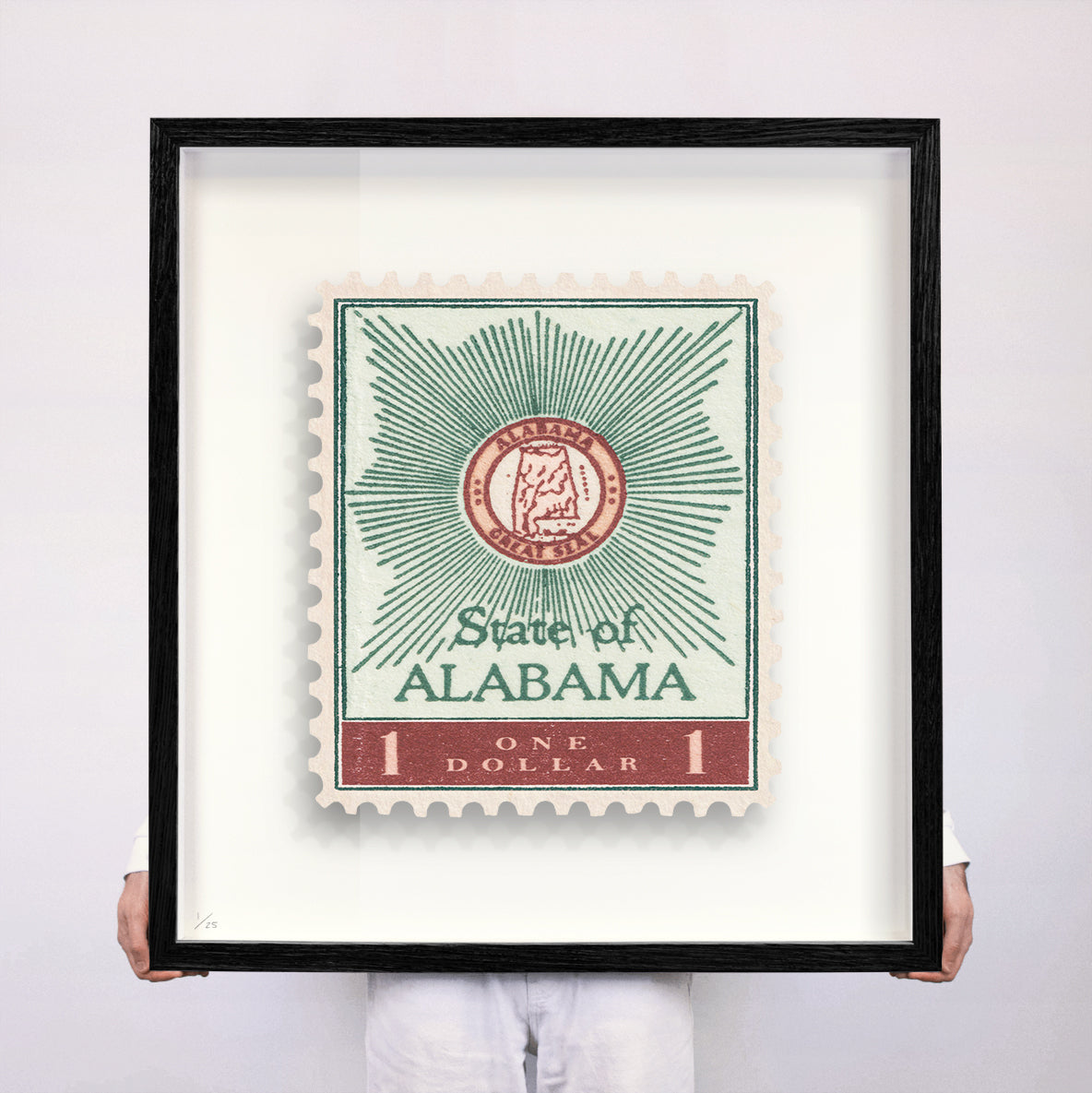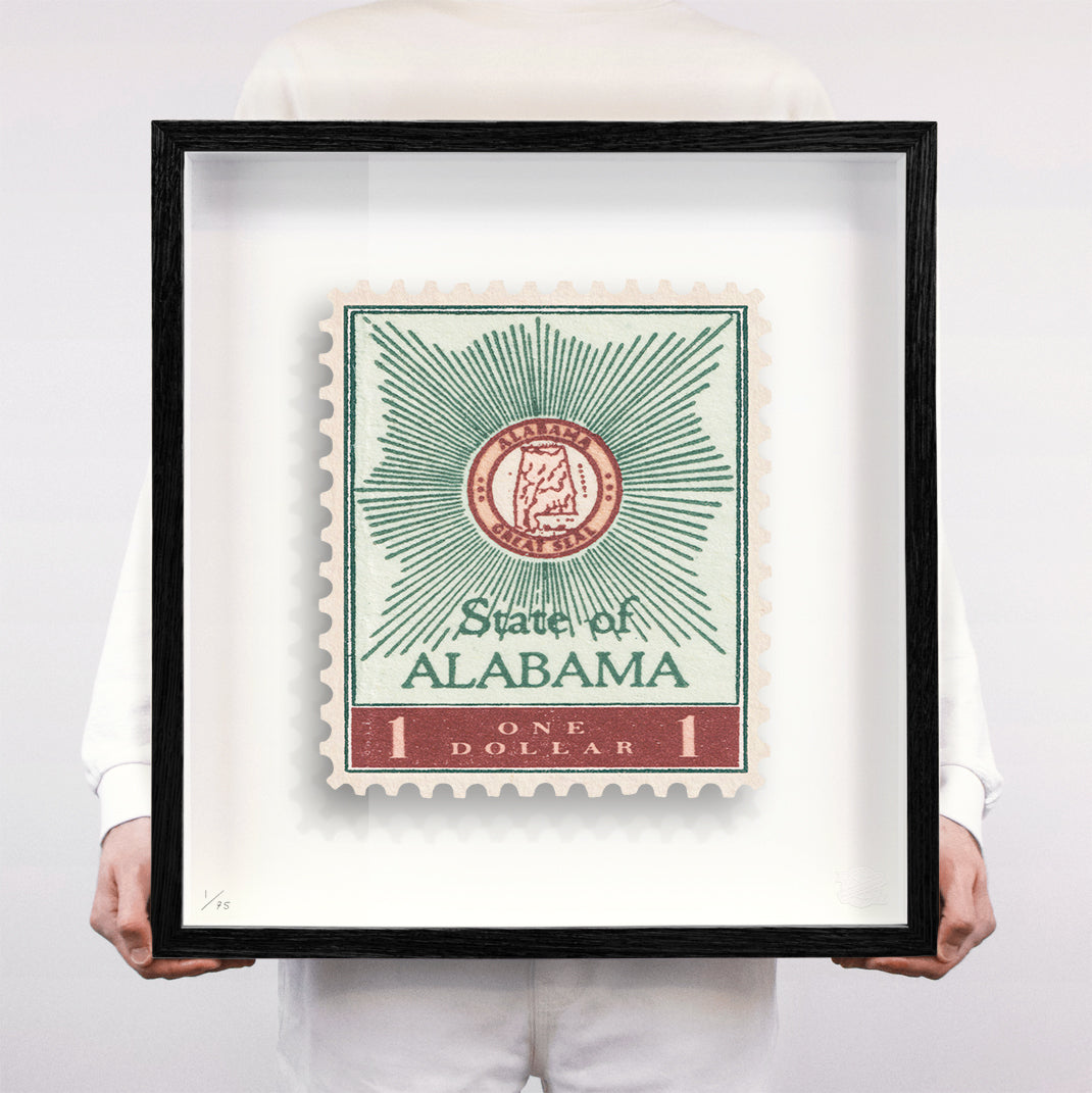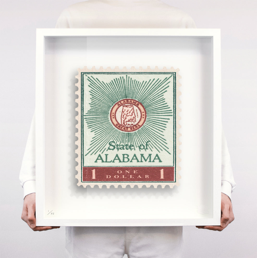 Each artwork by GuyGee has been digitally reimagined from an original postage stamp. Printed on archival mount board, the artwork is then float mounted and editioned. Finally the stamp is housed in one of the studio’s bespoke made box frames by the team.