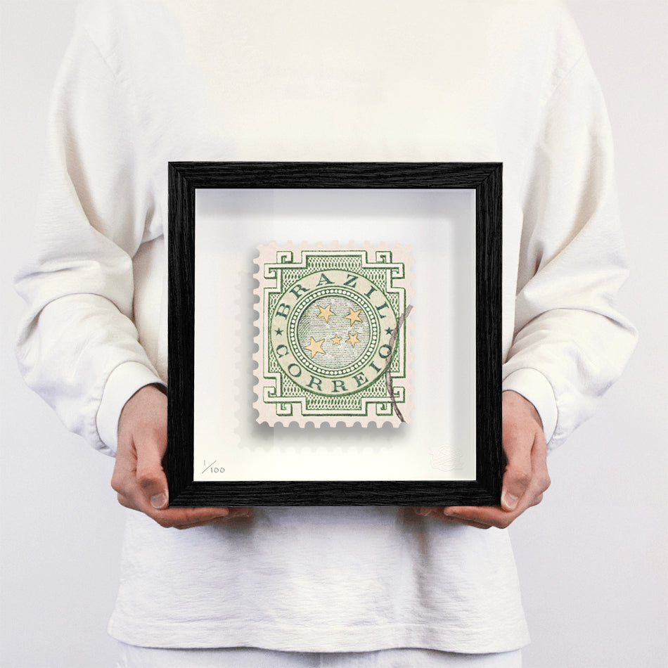 Each artwork by Guy Gee has been digitally reimagined from an original postage stamp. Printed on archival mount board, the artwork is then float mounted and editioned. Finally the stamp is housed in one of the studio’s bespoke made box frames by the team.