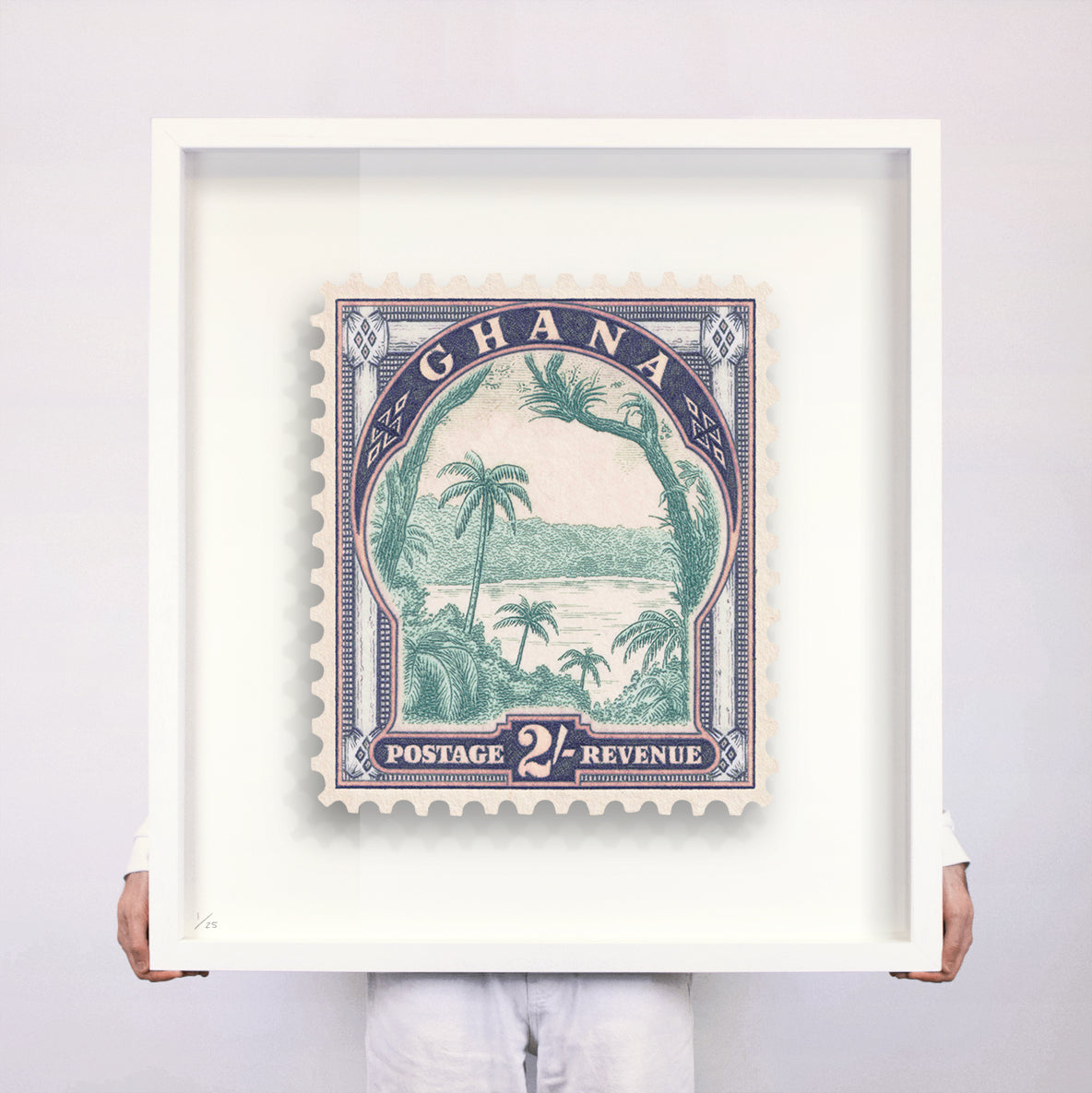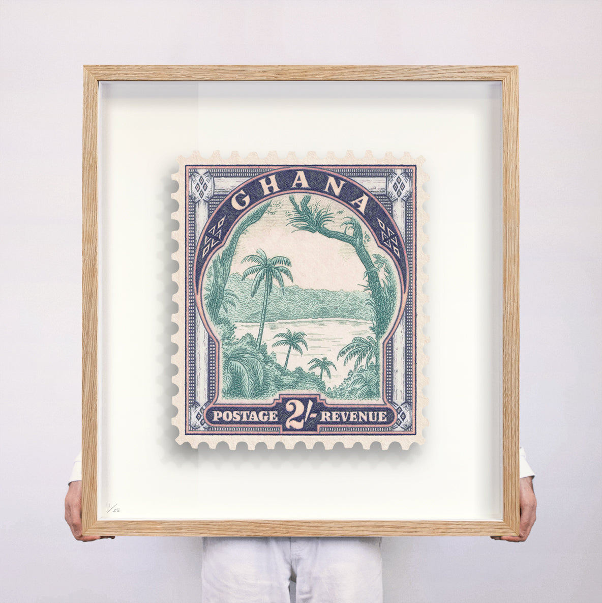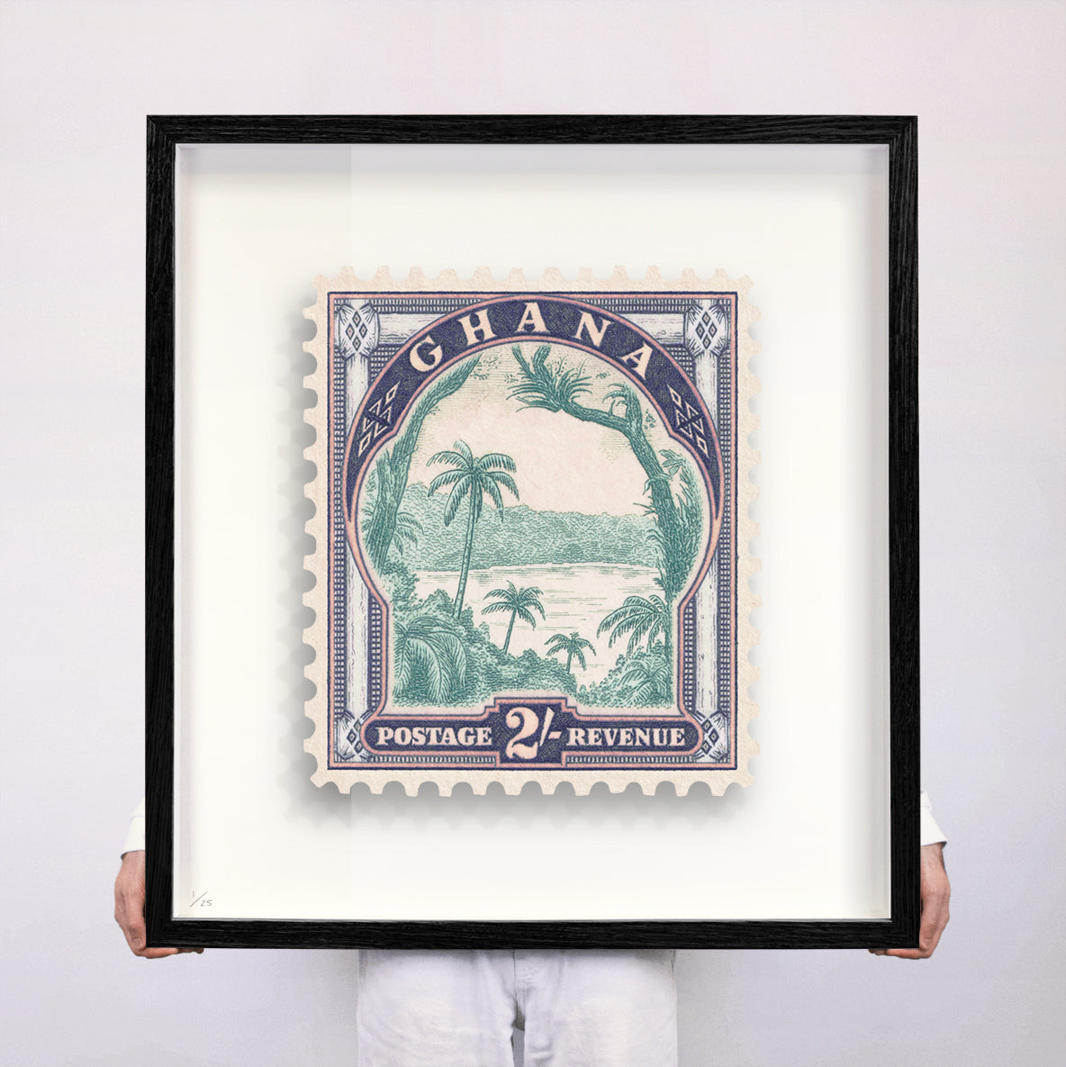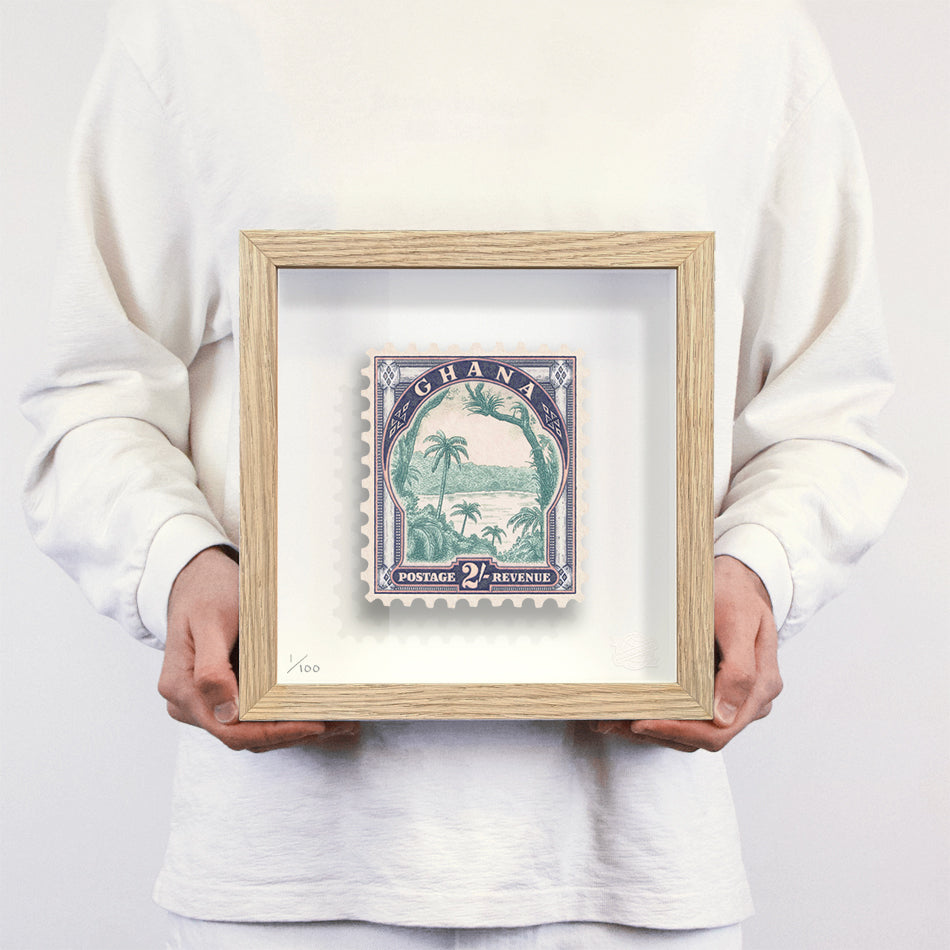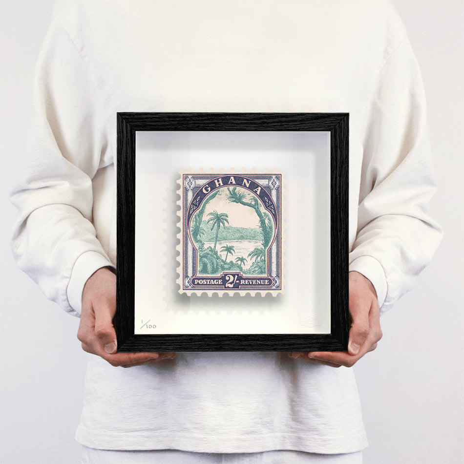 Each artwork by Guy Gee has been digitally reimagined from an original postage stamp. Printed on archival mount board, the artwork is then float mounted and editioned. Finally the stamp is housed in one of the studio’s bespoke made box frames by the team.