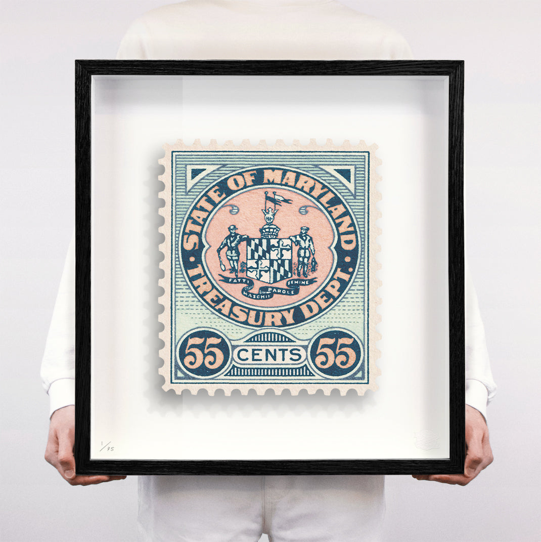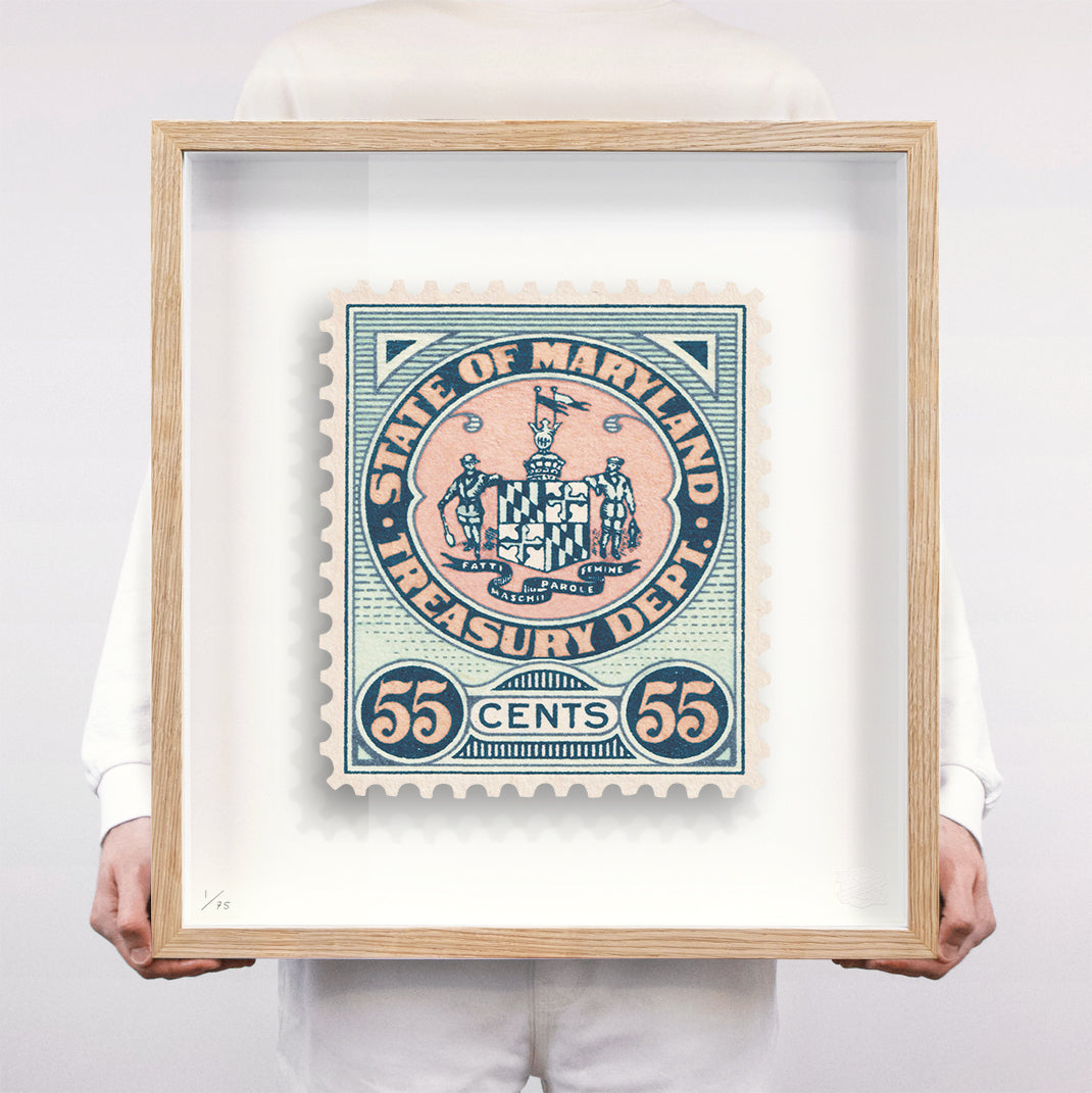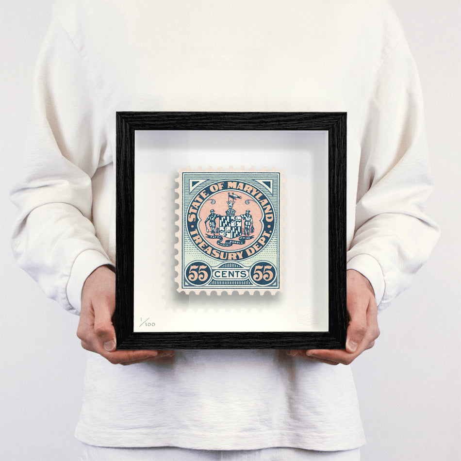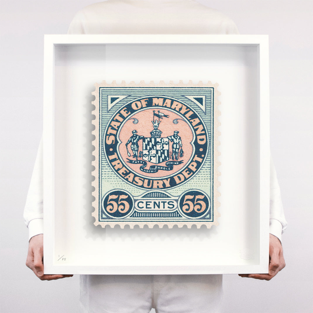 Each artwork by Guy Gee has been digitally reimagined from an original postage stamp. Printed on archival mount board, the artwork is then float mounted and editioned. Finally the stamp is housed in one of the studio’s bespoke made box frames by the team.