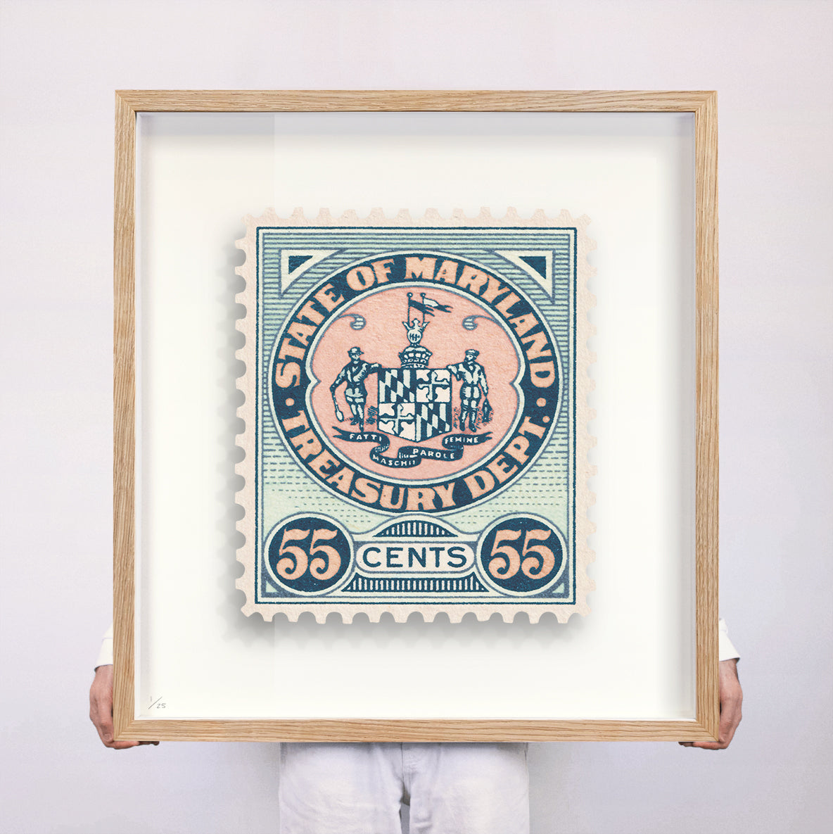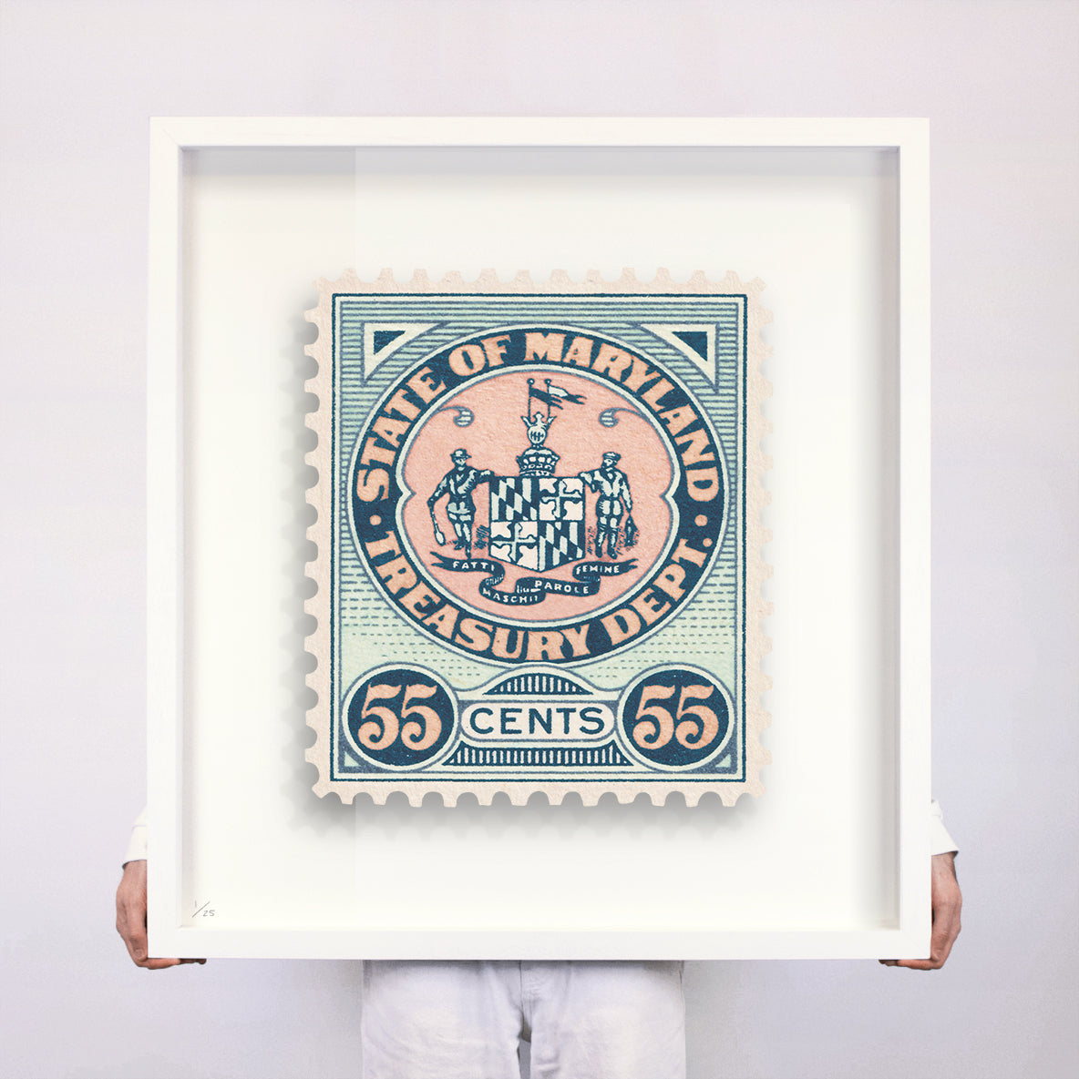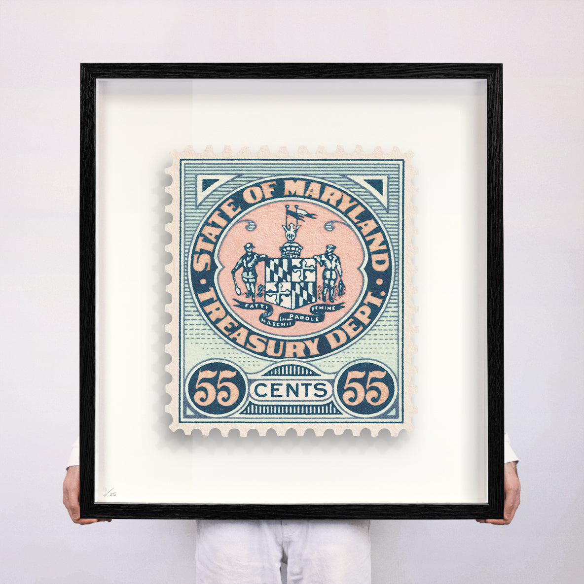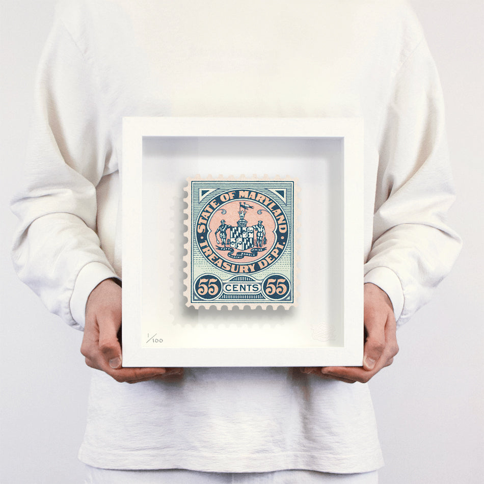 Each artwork by Guy Gee has been digitally reimagined from an original postage stamp. Printed on archival mount board, the artwork is then float mounted and editioned. Finally the stamp is housed in one of the studio’s bespoke made box frames by the team.