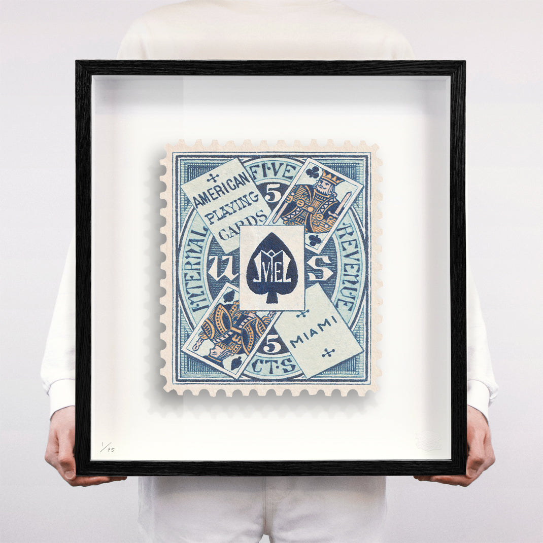 Each artwork by Guy Gee has been digitally reimagined from an original postage stamp. Printed on archival mount board, the artwork is then float mounted and editioned. Finally the stamp is housed in one of the studio’s bespoke made box frames by the team.