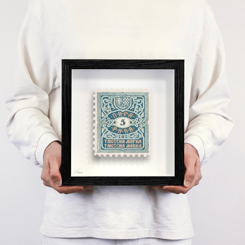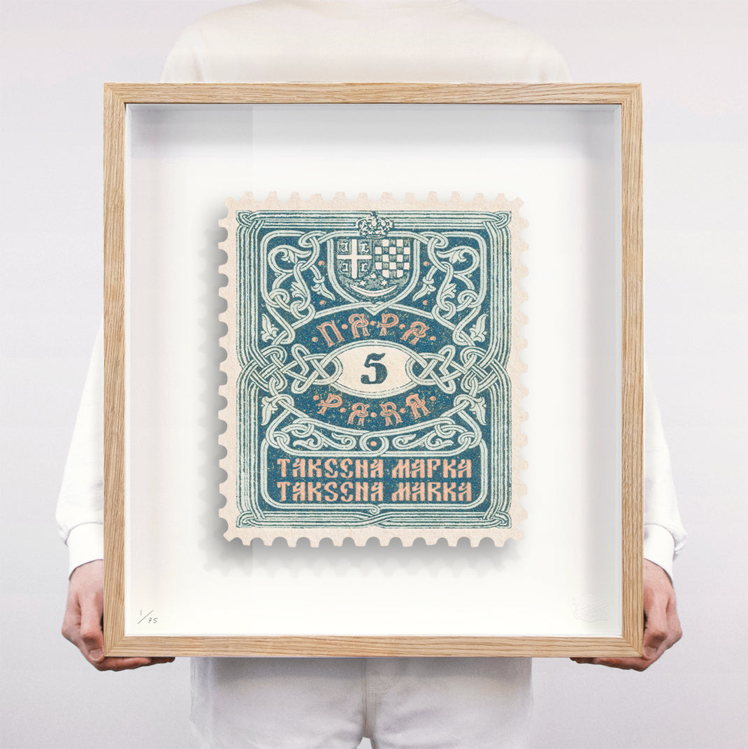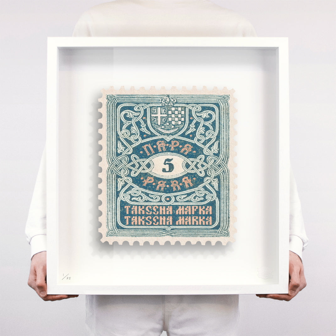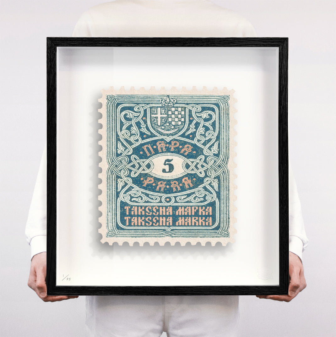 Each artwork by Guy Gee has been digitally reimagined from an original postage stamp. Printed on archival mount board, the artwork is then float mounted and editioned. Finally the stamp is housed in one of the studio’s bespoke made box frames by the team.