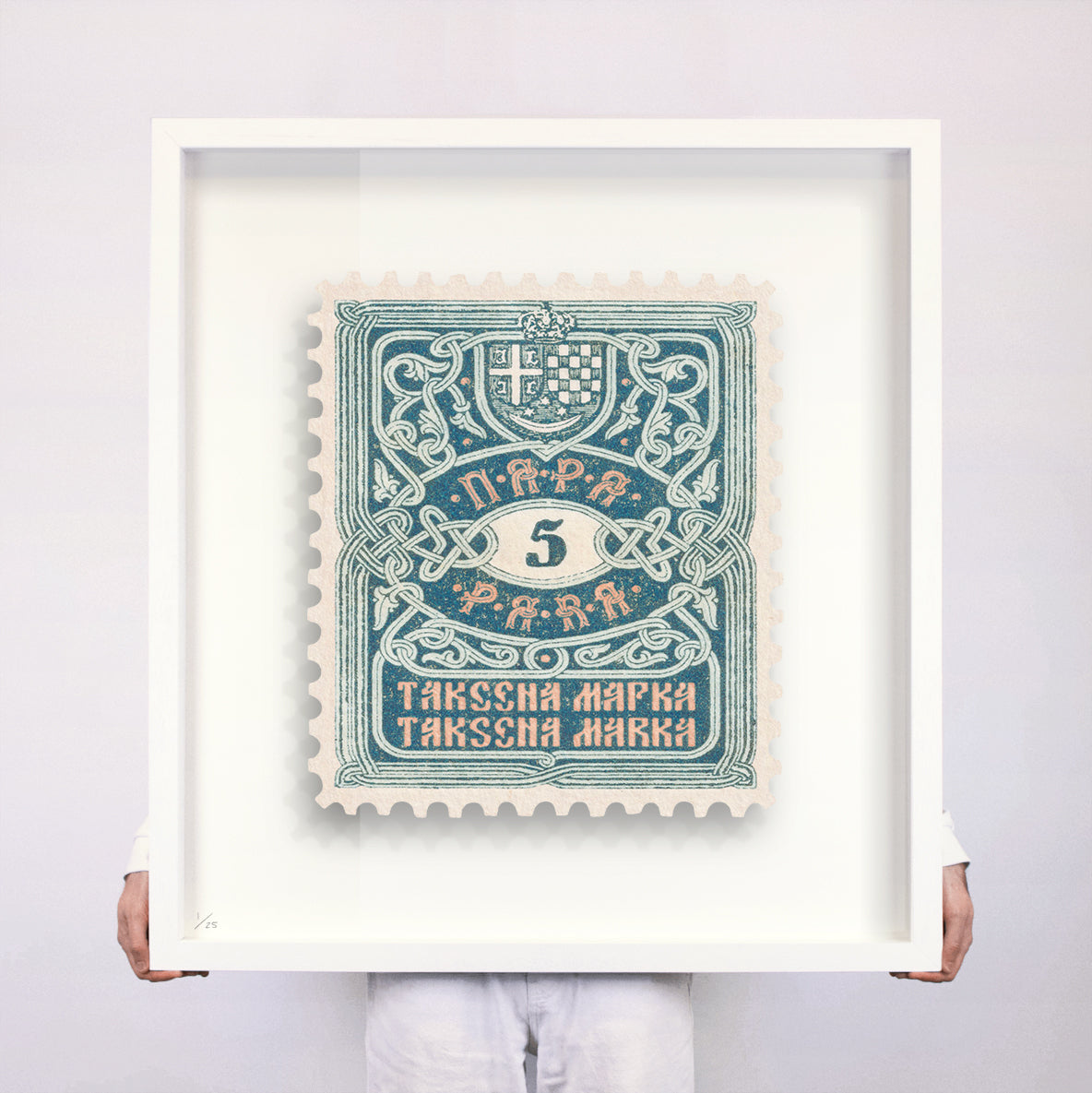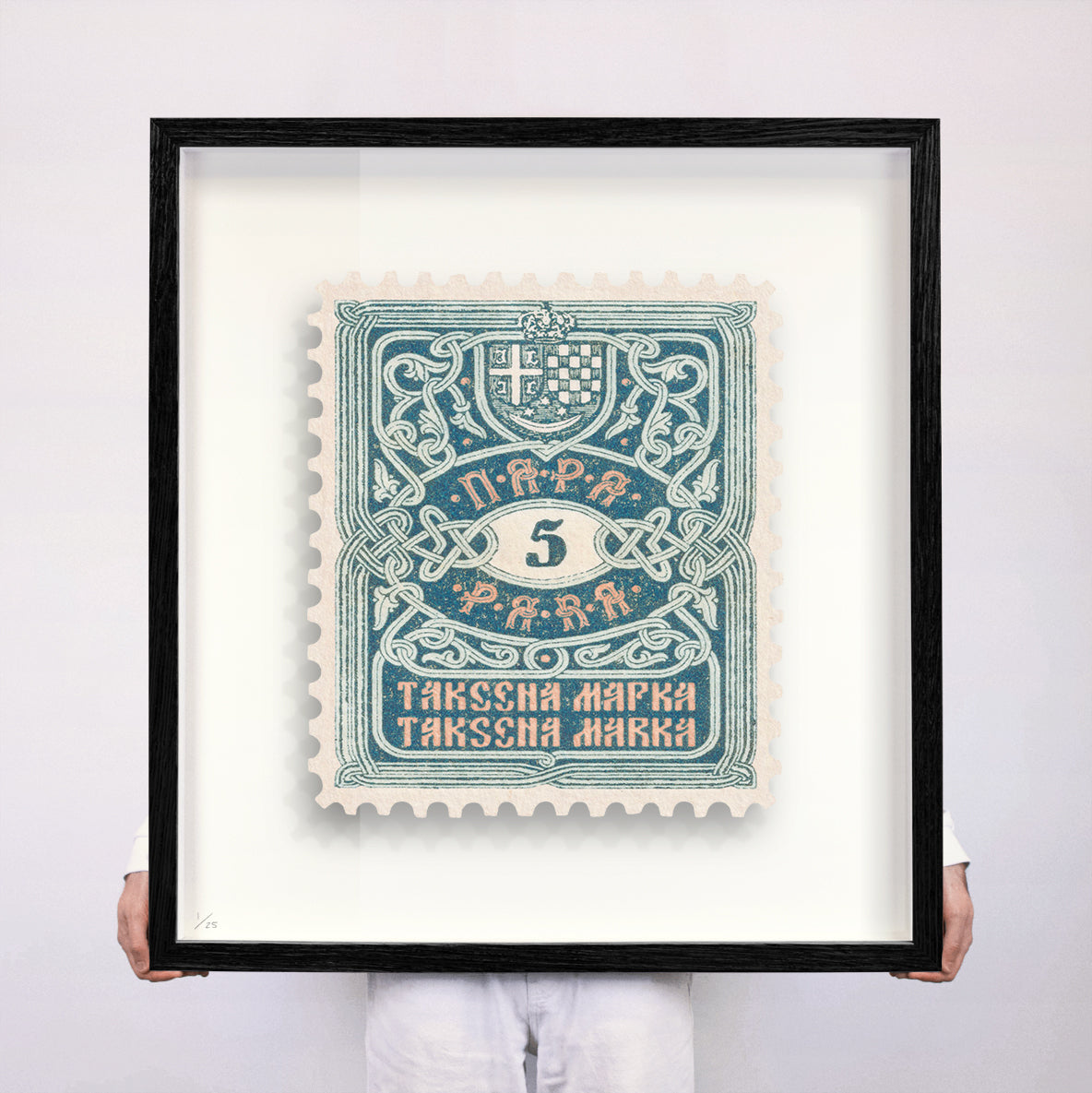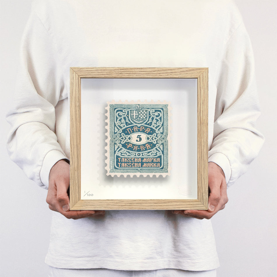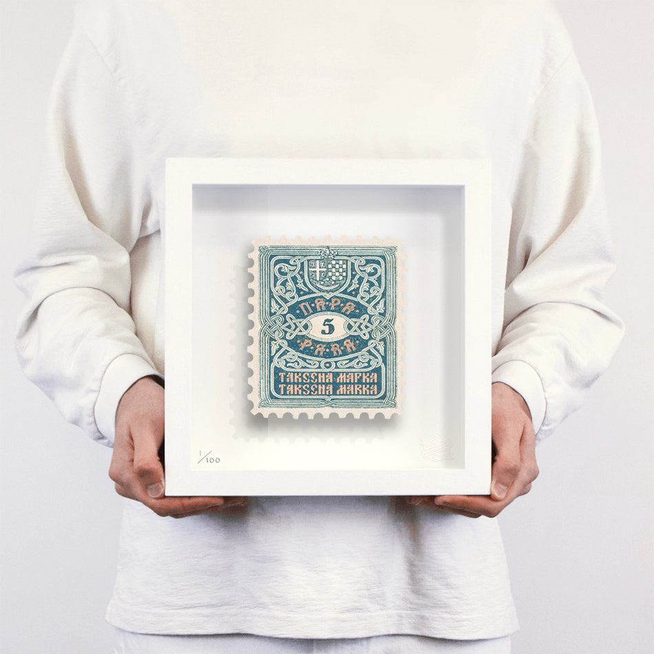 Each artwork by Guy Gee has been digitally reimagined from an original postage stamp. Printed on archival mount board, the artwork is then float mounted and editioned. Finally the stamp is housed in one of the studio’s bespoke made box frames by the team.