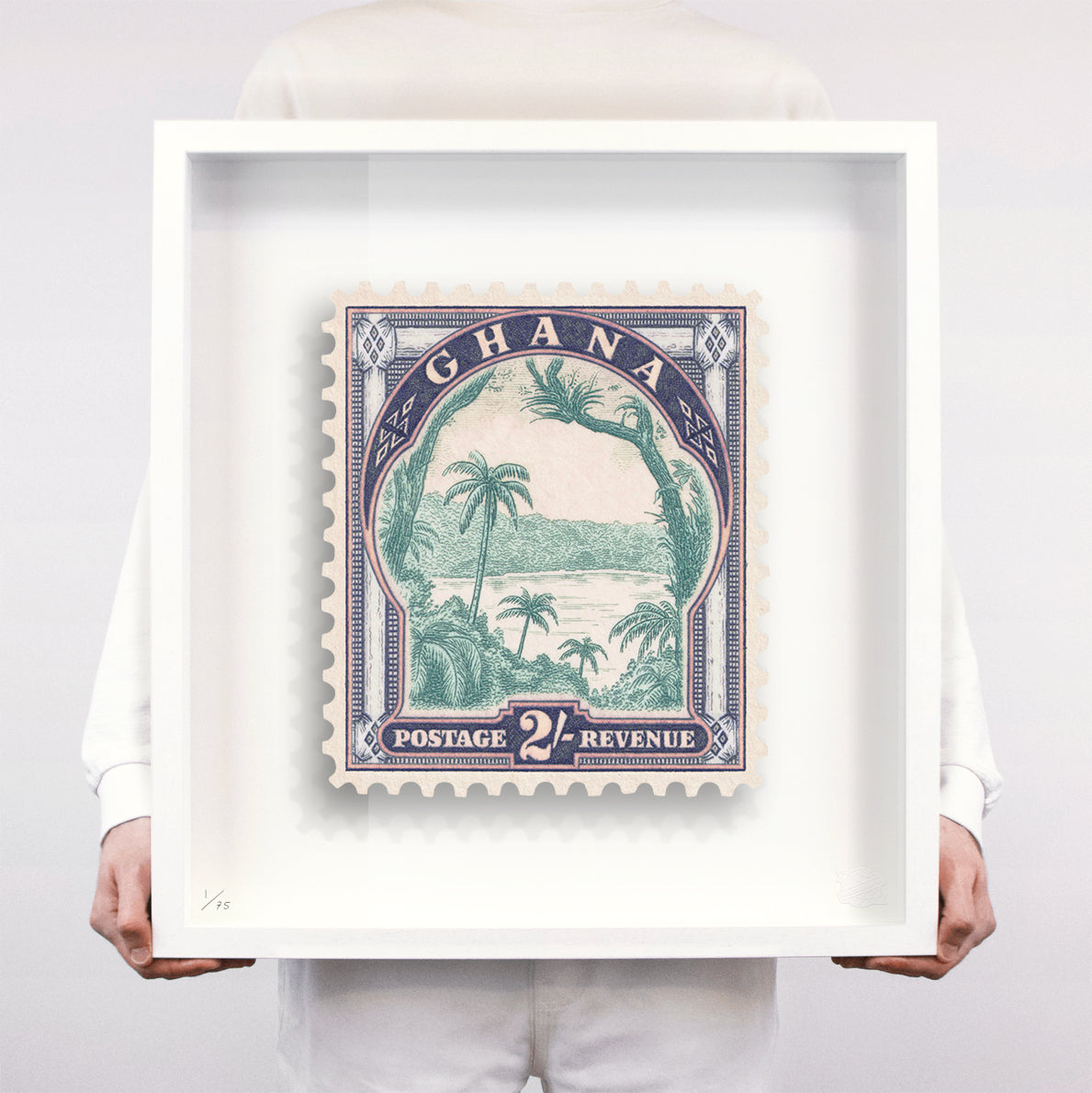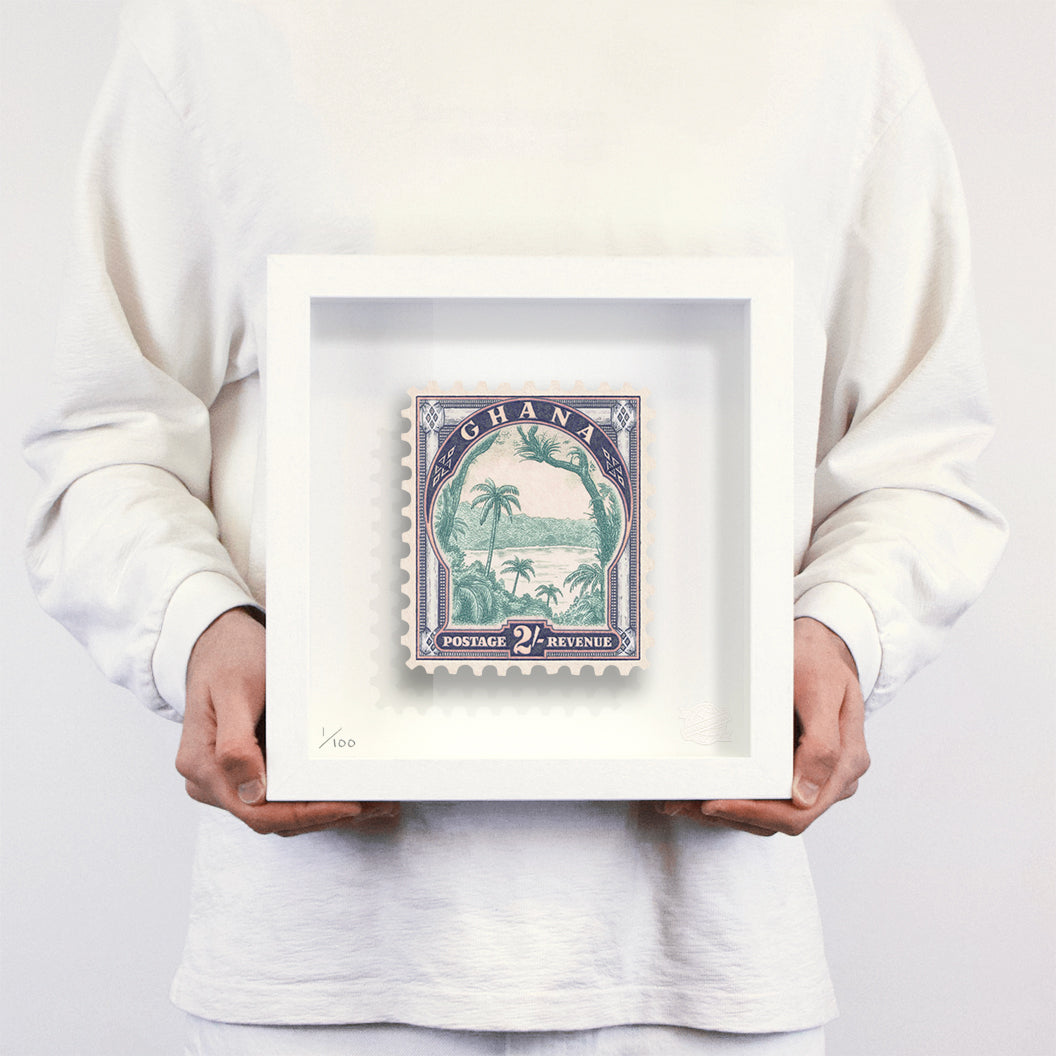 Each artwork by Guy Gee has been digitally reimagined from an original postage stamp. Printed on archival mount board, the artwork is then float mounted and editioned. Finally the stamp is housed in one of the studio’s bespoke made box frames by the team.