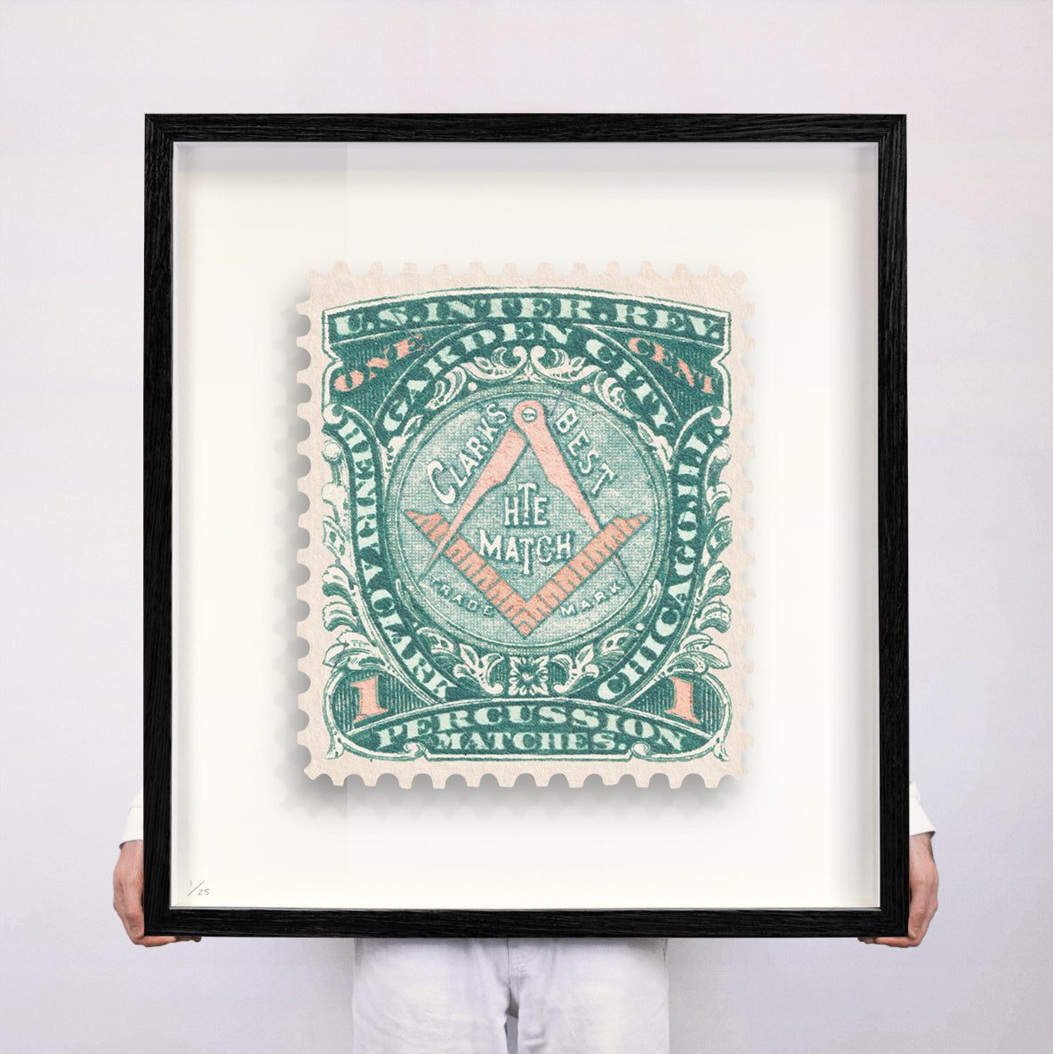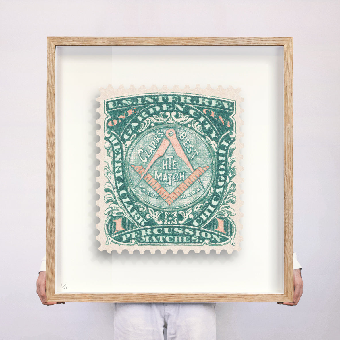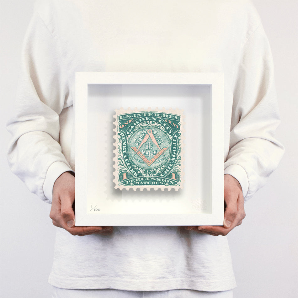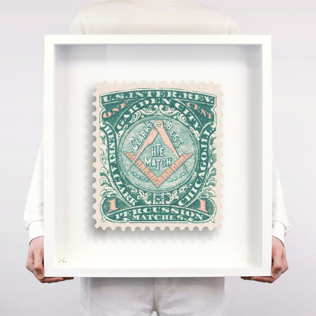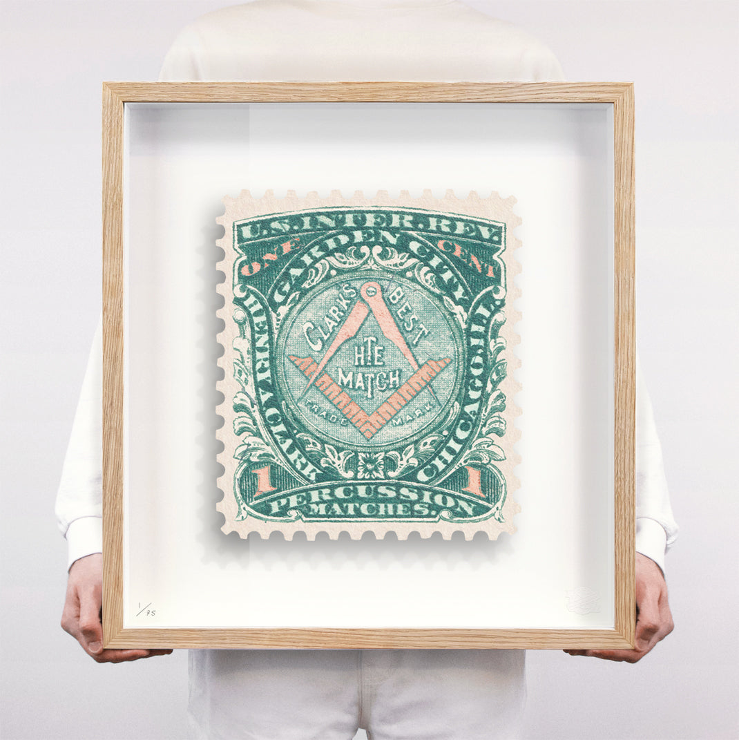 Each artwork by Guy Gee has been digitally reimagined from an original postage stamp. Printed on archival mount board, the artwork is then float mounted and editioned. Finally the stamp is housed in one of the studio’s bespoke made box frames by the team.