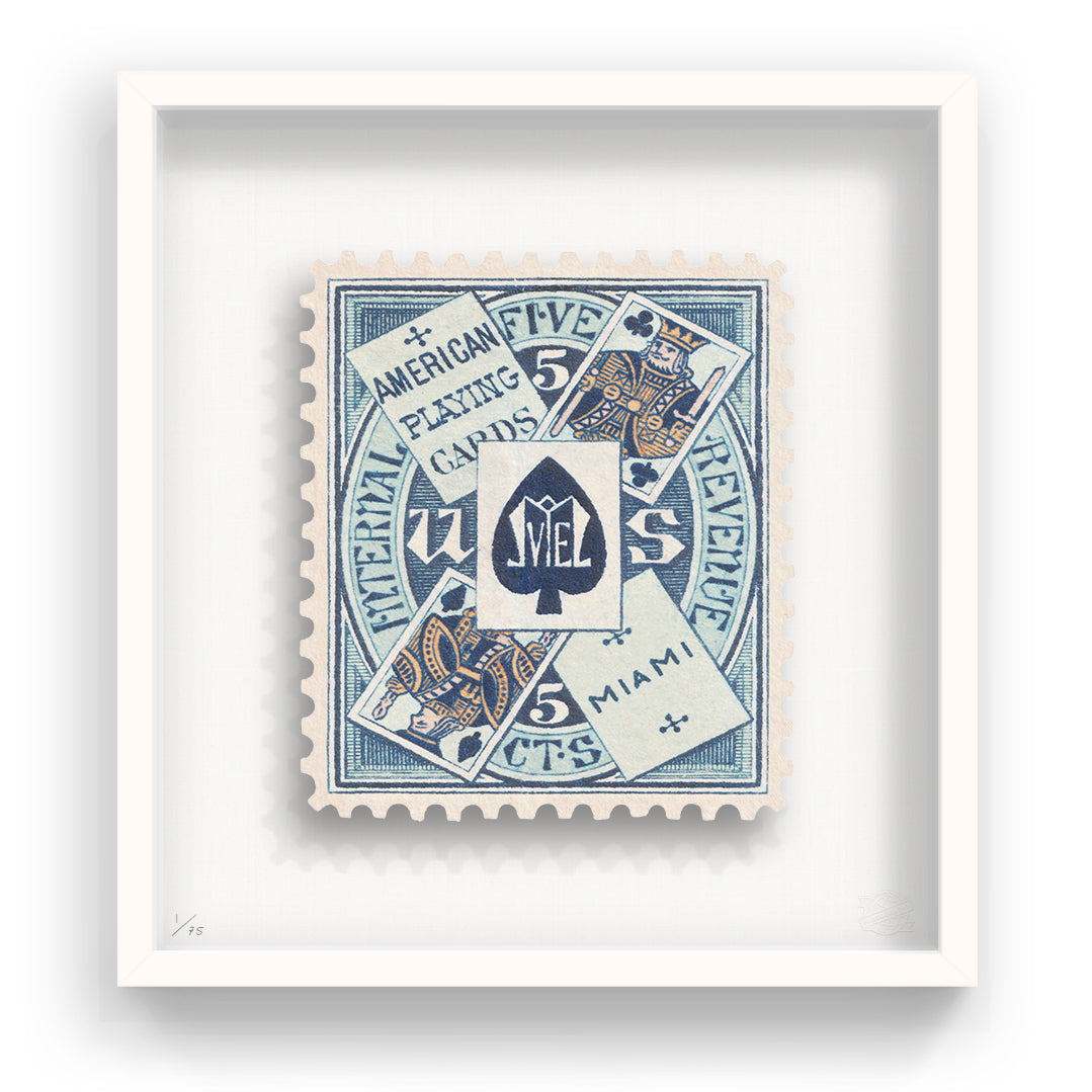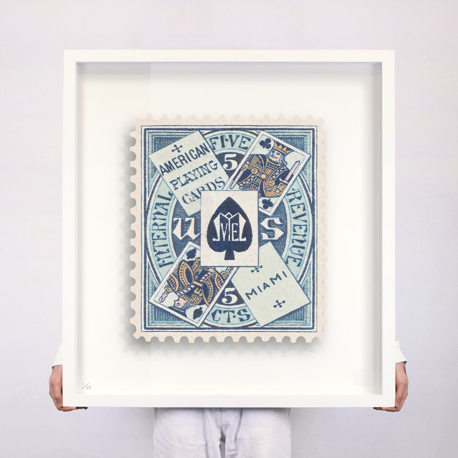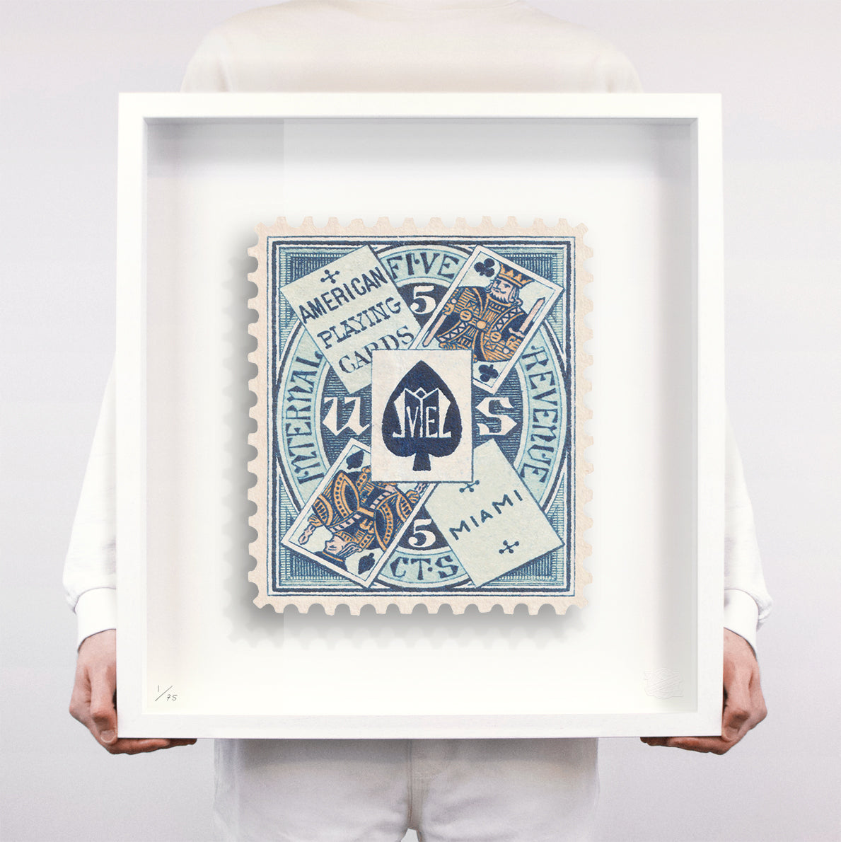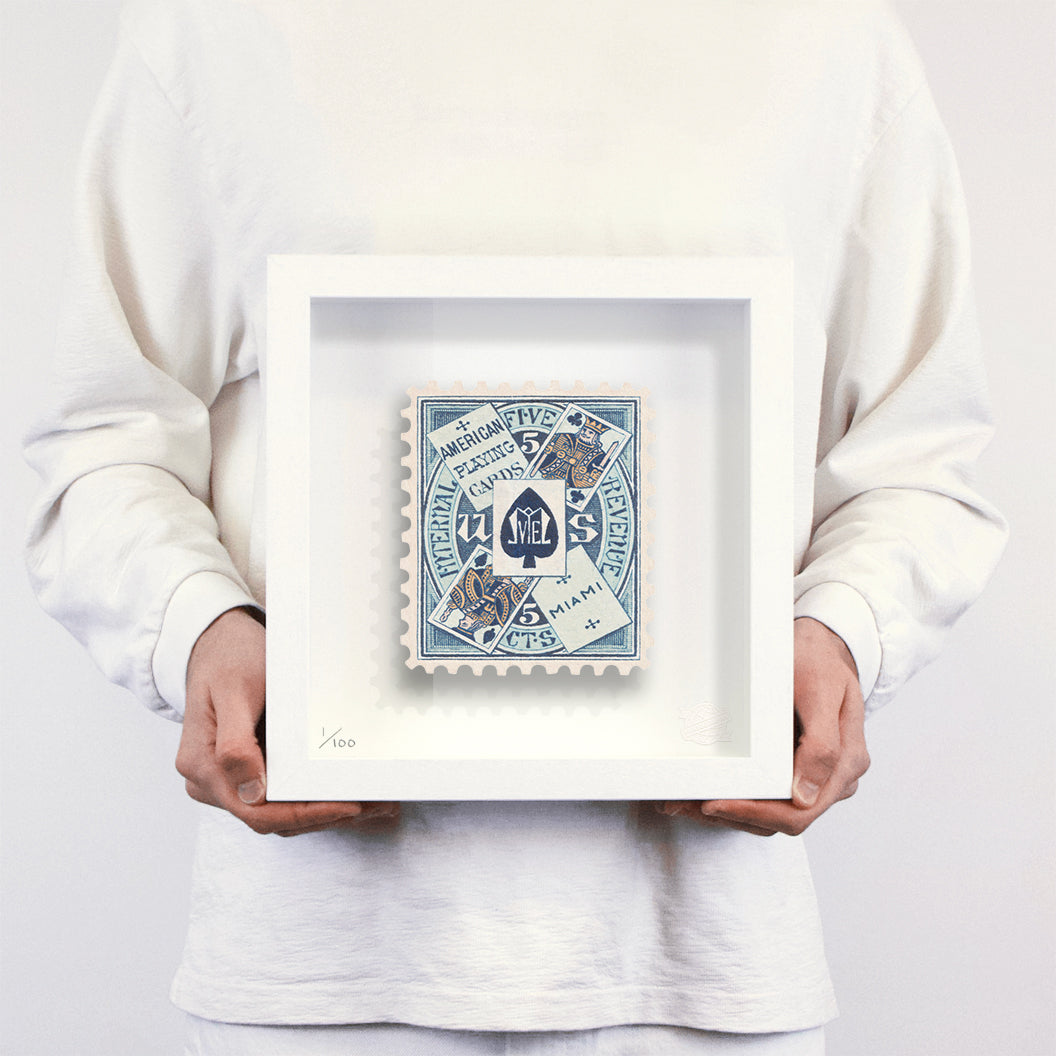Each artwork by Guy Gee has been digitally reimagined from an original postage stamp. Printed on archival mount board, the artwork is then float mounted and editioned. Finally the stamp is housed in one of the studio’s bespoke made box frames by the team.